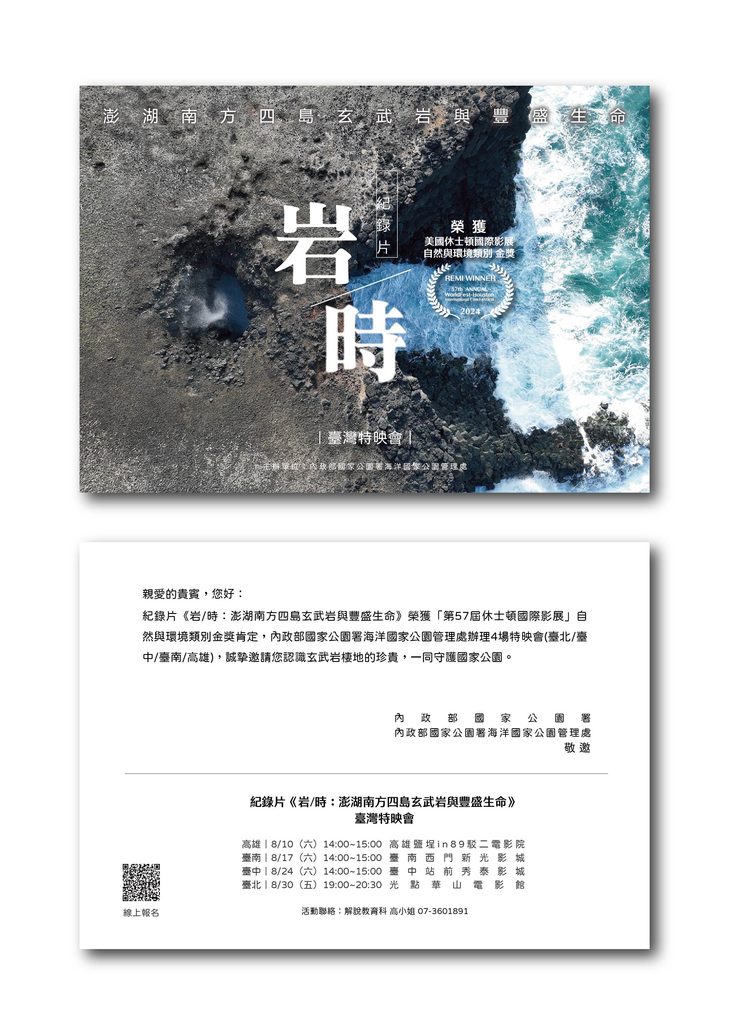 二、旨揭紀錄片以影像呈現澎湖南方四島國家公園玄武岩地質、生態、人文及棲地保育等多元內涵,並榮獲「第57屆休士頓國際影展」(57thWorldFest-Houston)自然與環境類別(Nature&Wildlife,Film&VideoPrdns)金獎(Gold)肯定。