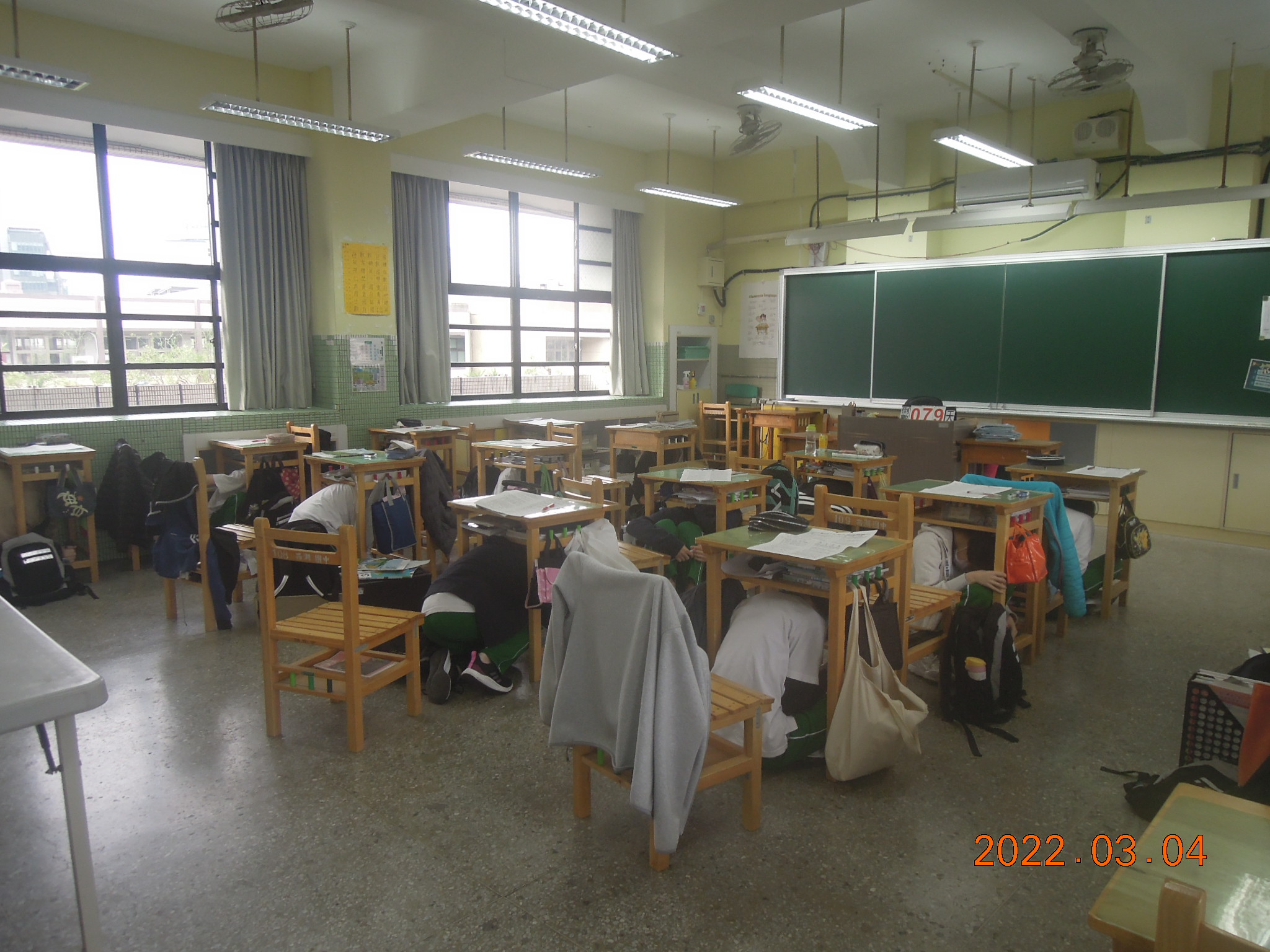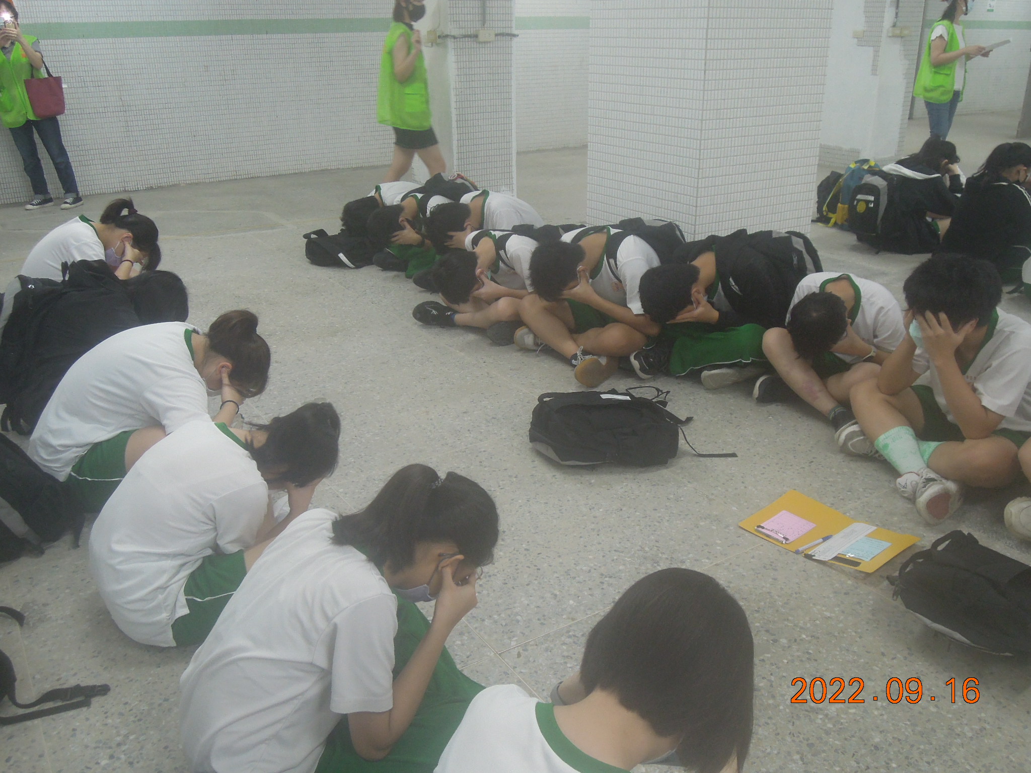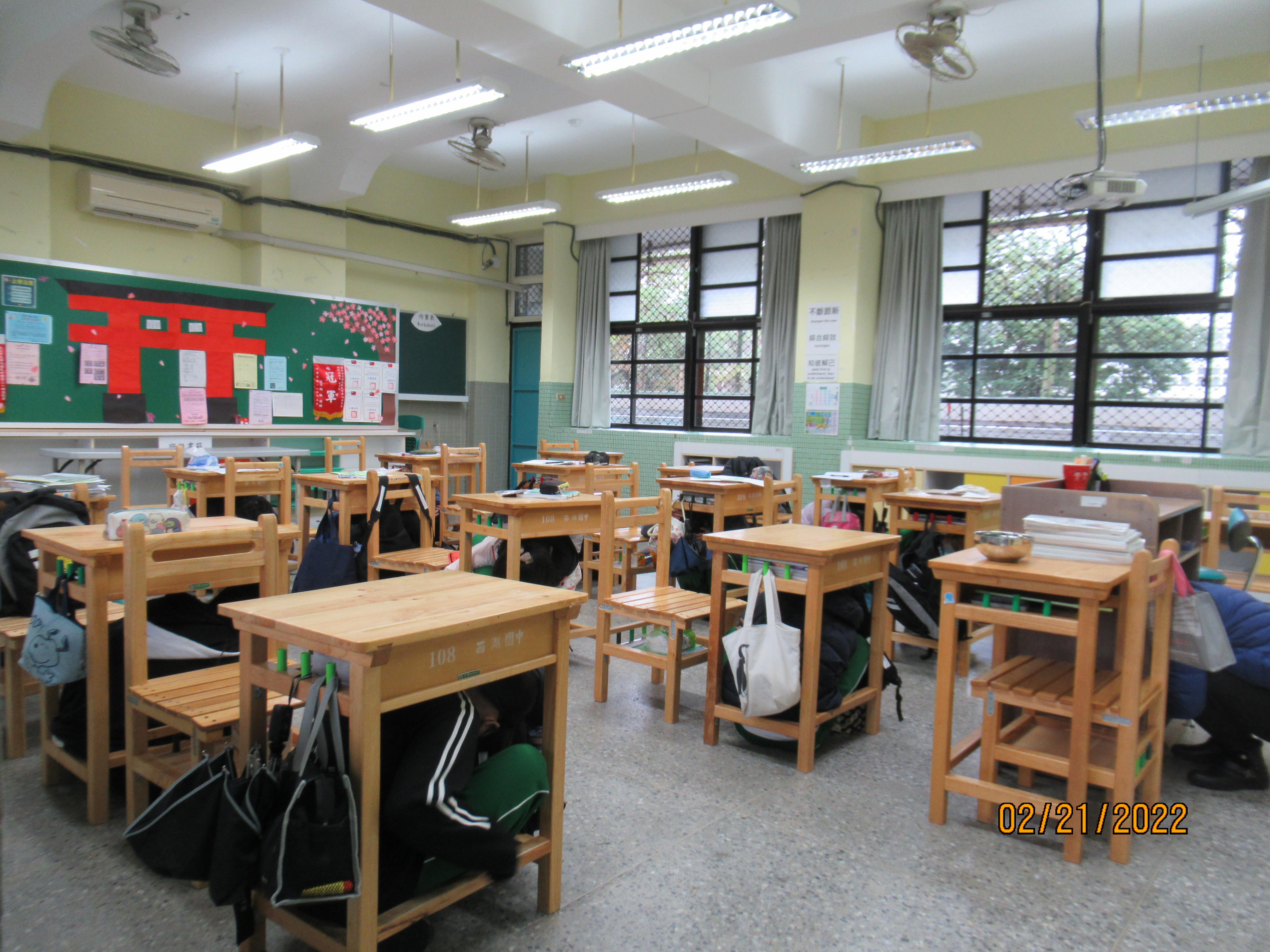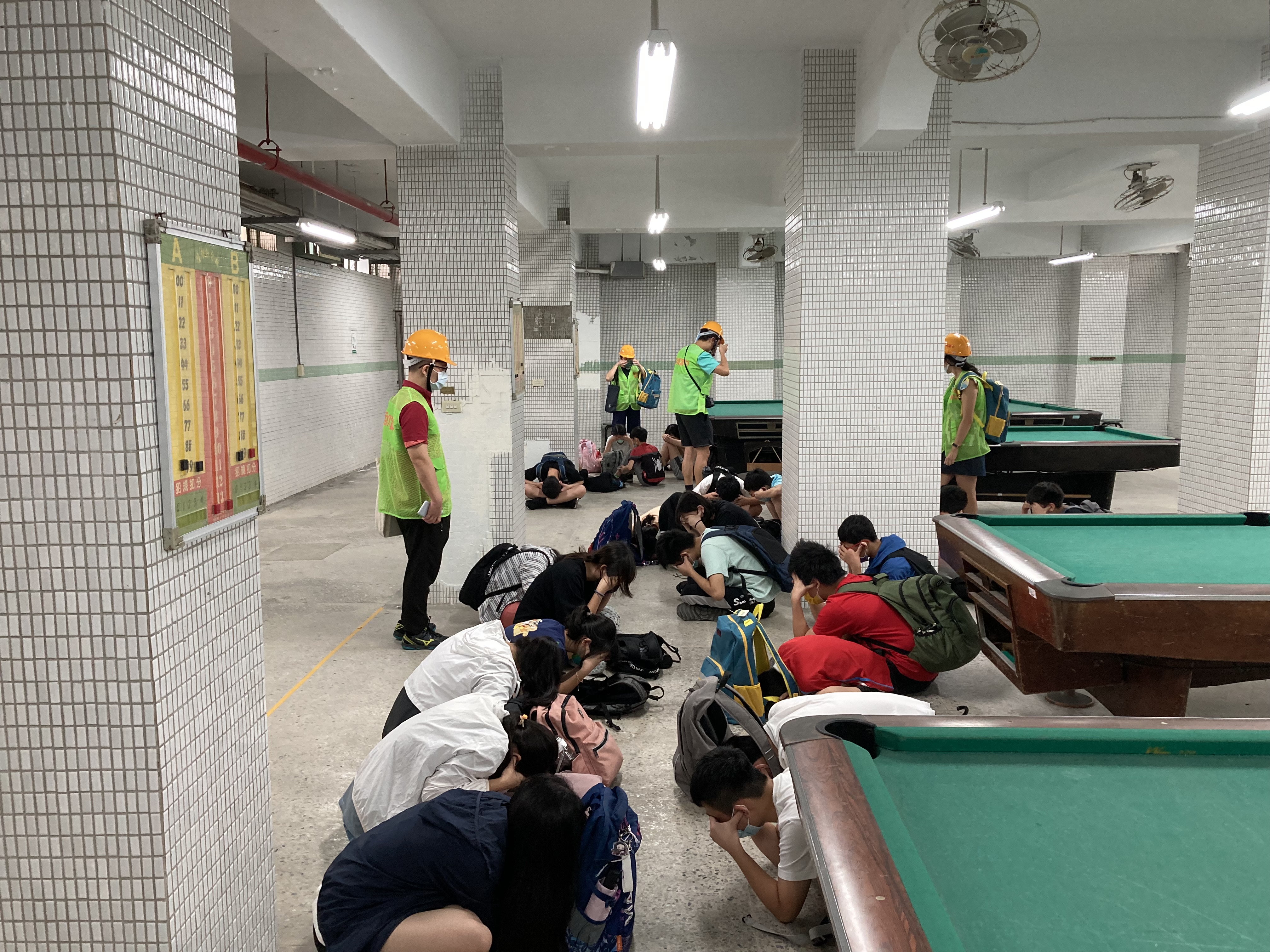 ▲無預警演練當天因遇大雨,僅進行室內地震防護演練,未至操場集合。 |