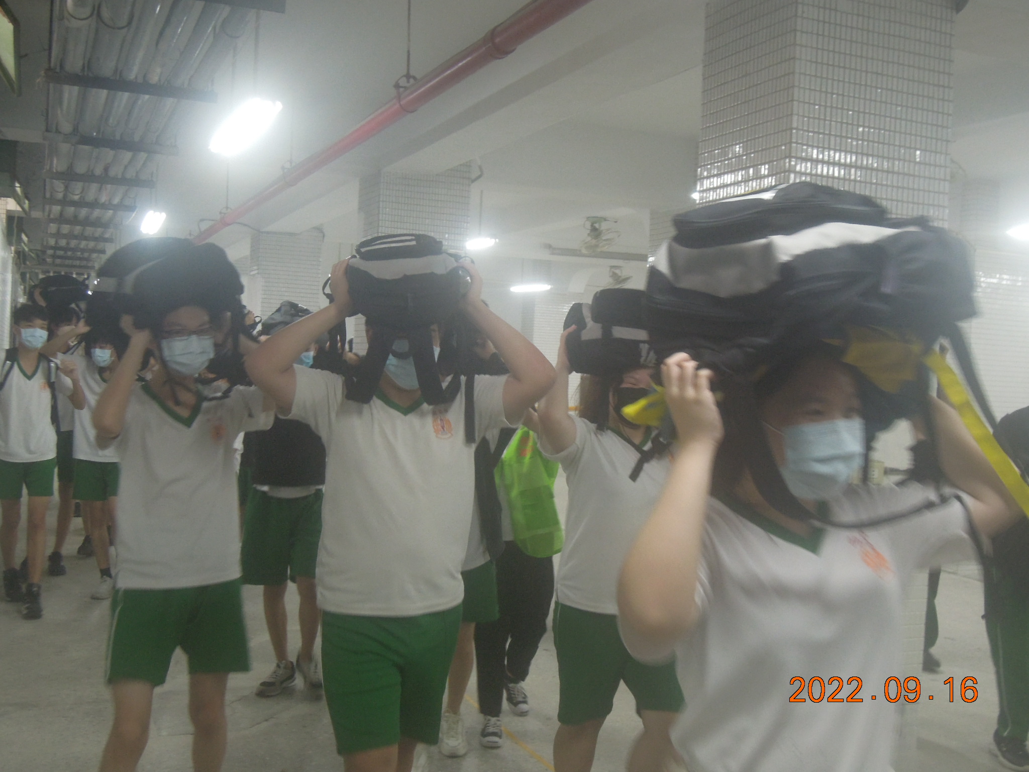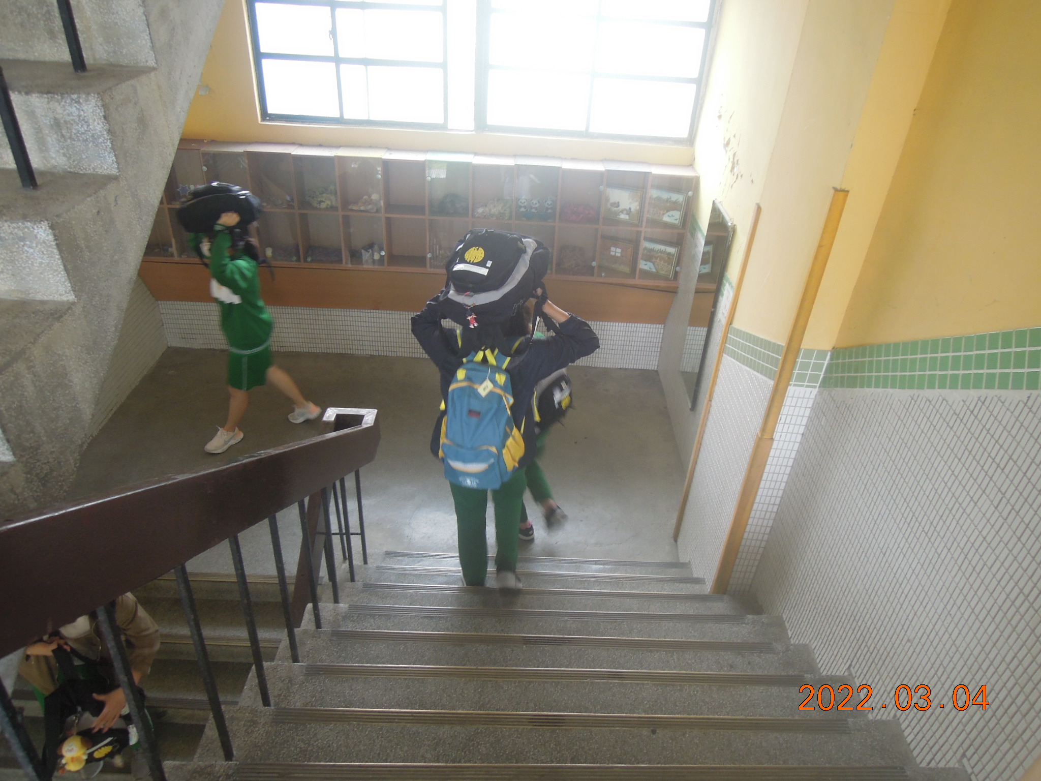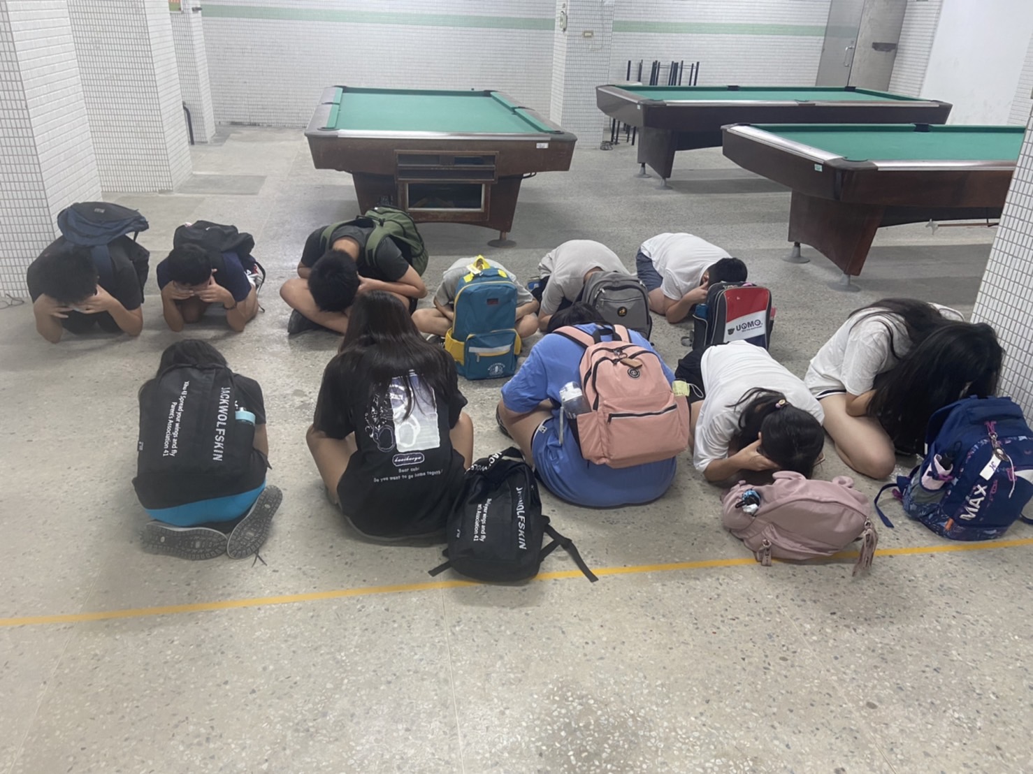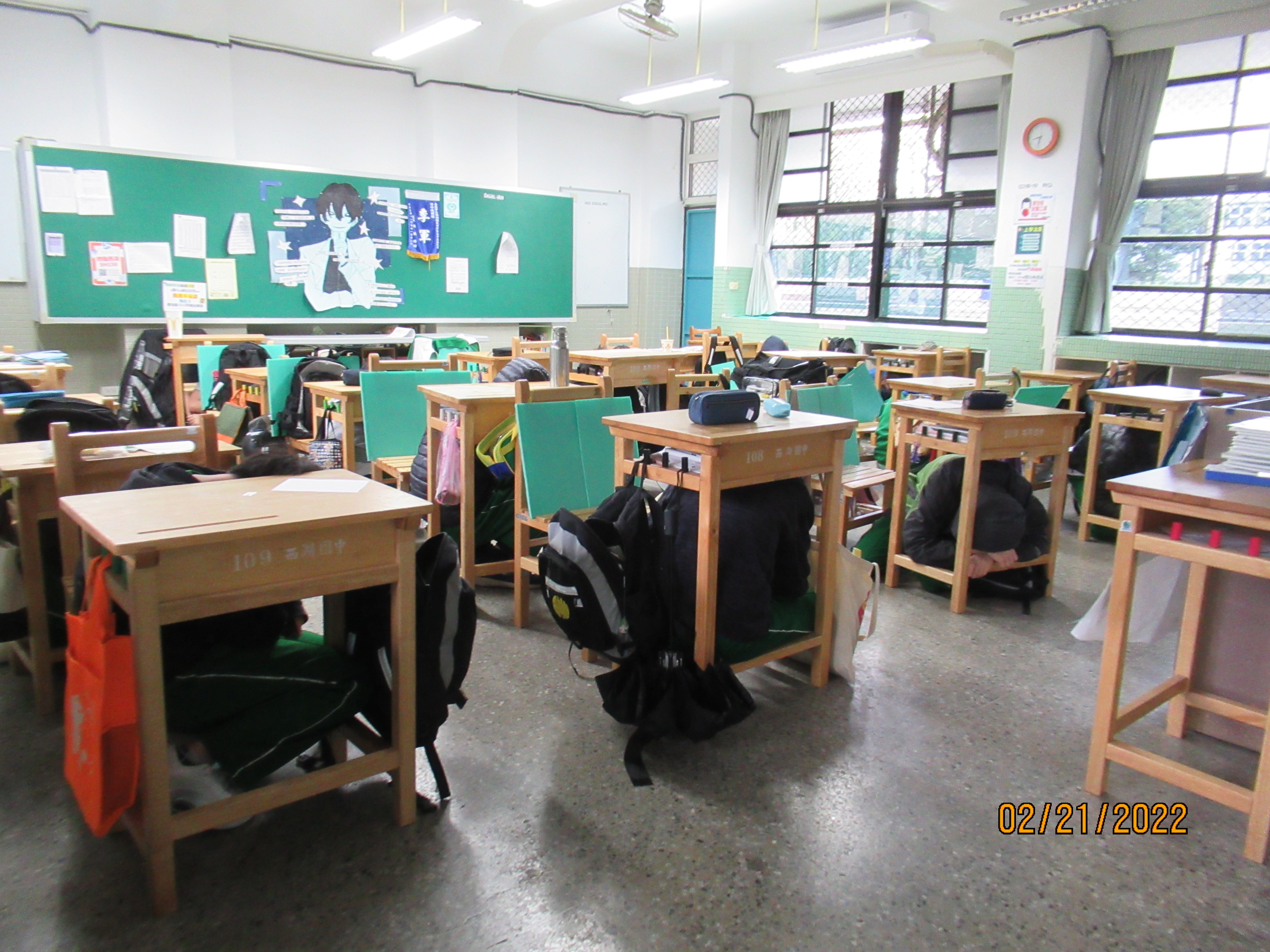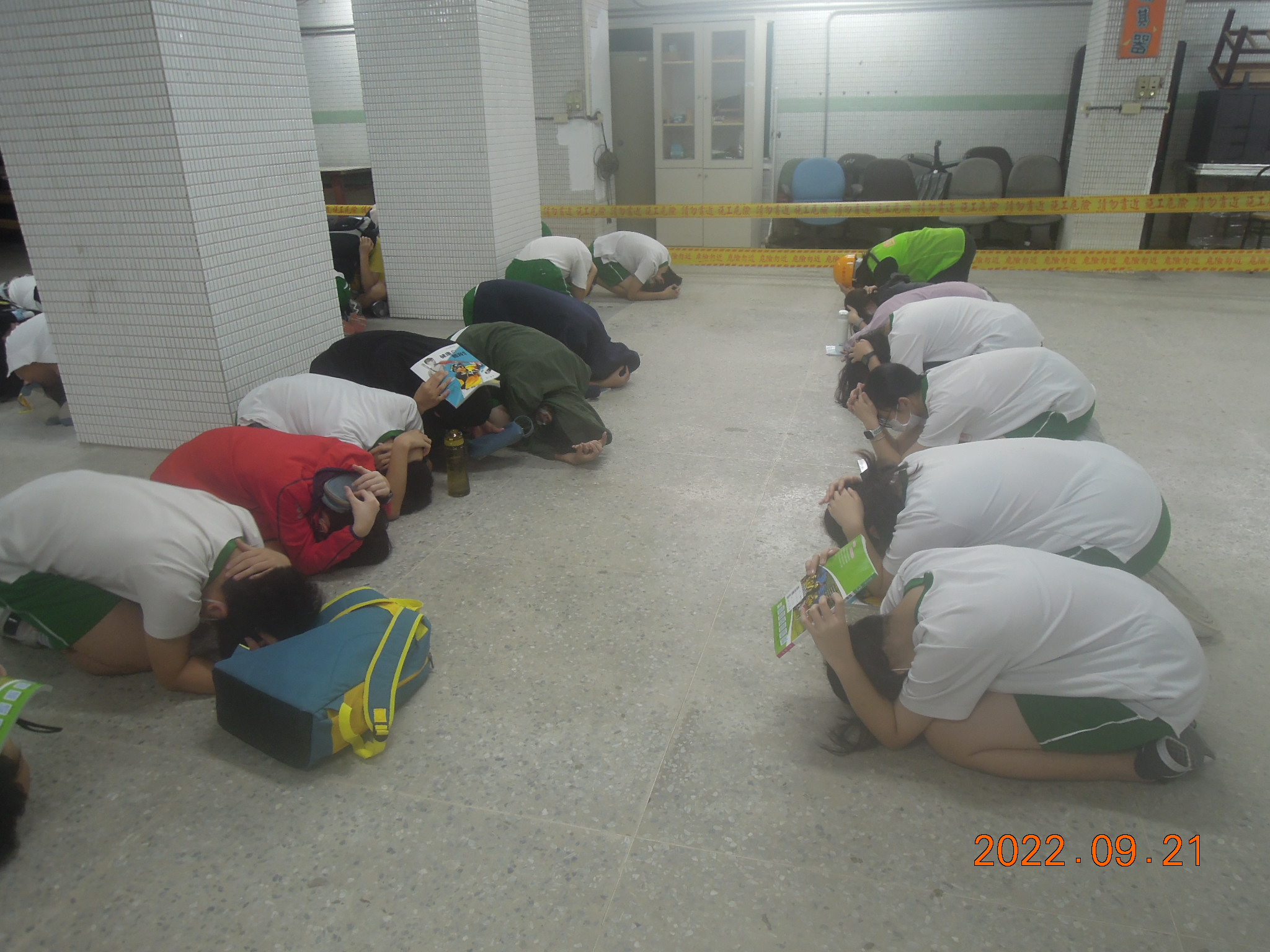 ▲無預警演練當天因遇大雨,僅進行室內地震防護演練,未至操場集合。 |