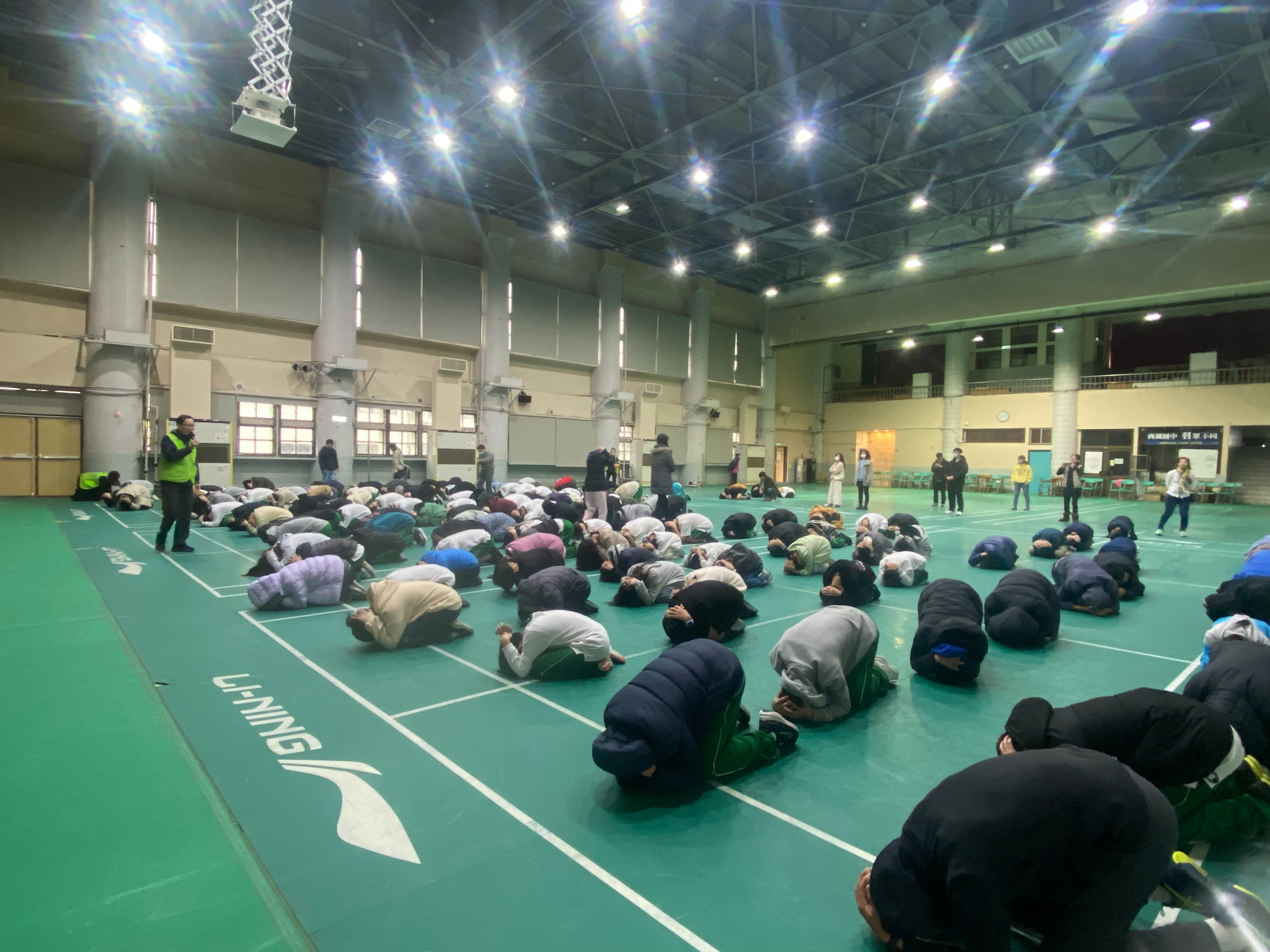 ▲地震發生-趴下、掩護、穩住(活動中心) | ▲地震暫歇-快速前往操場 |