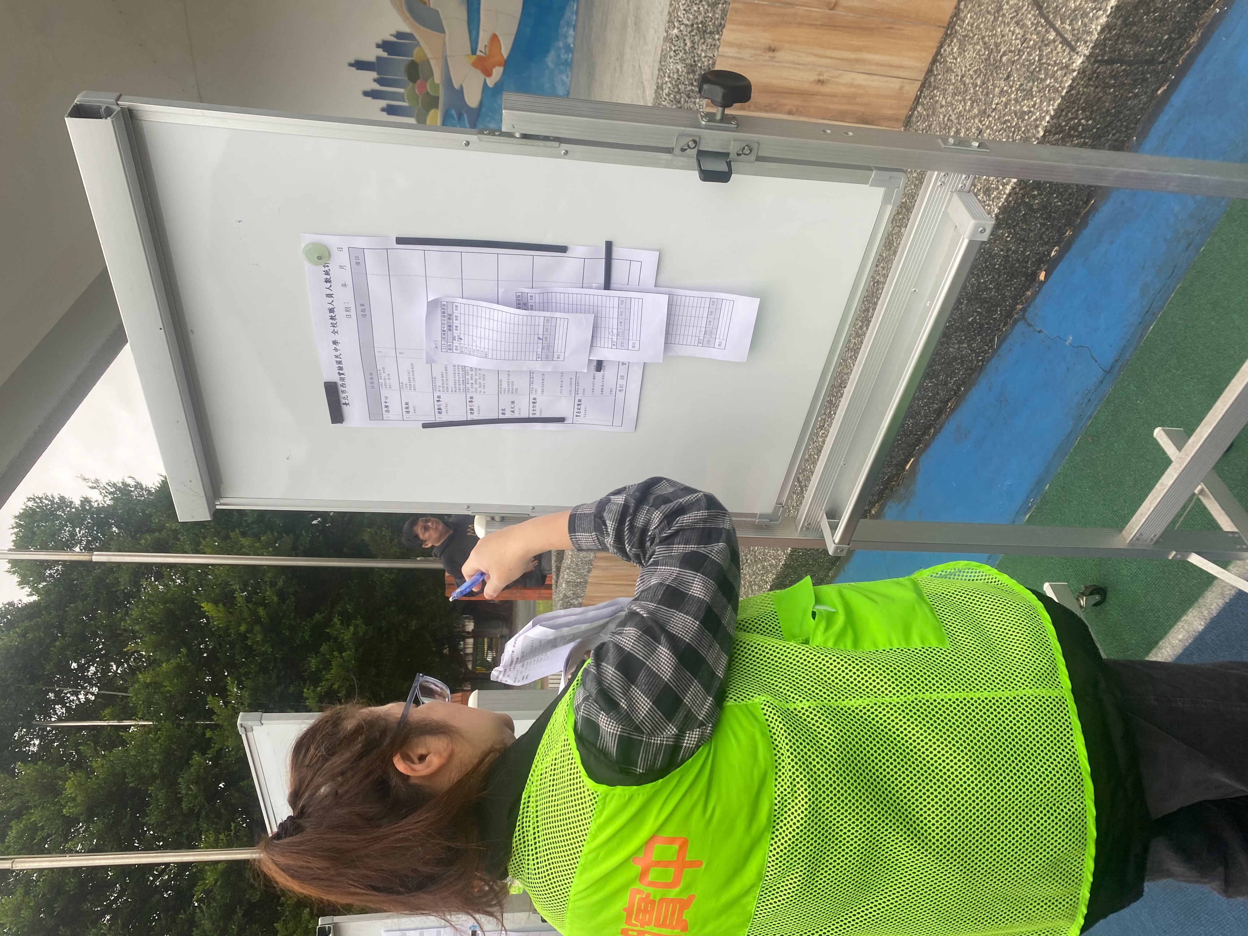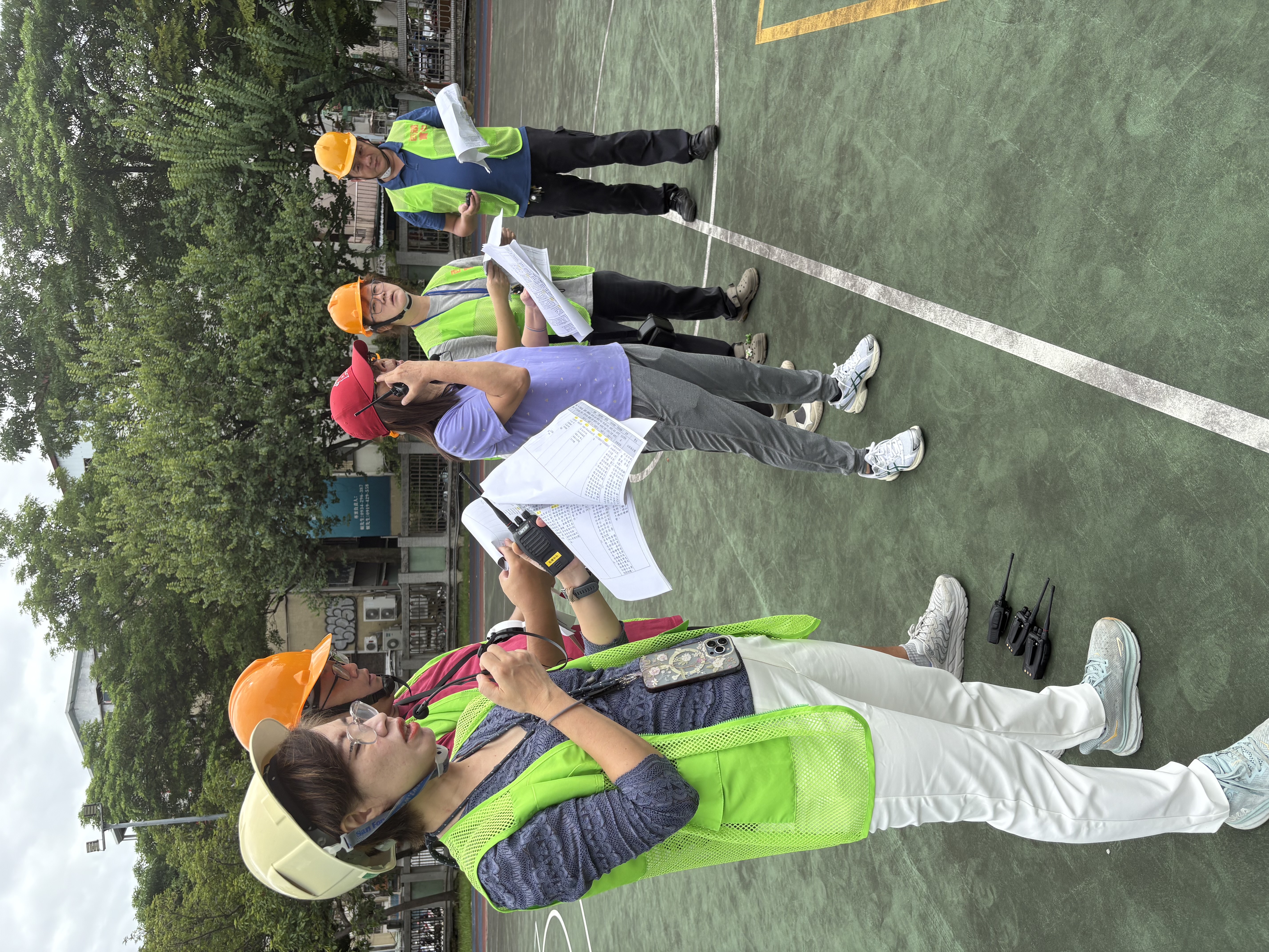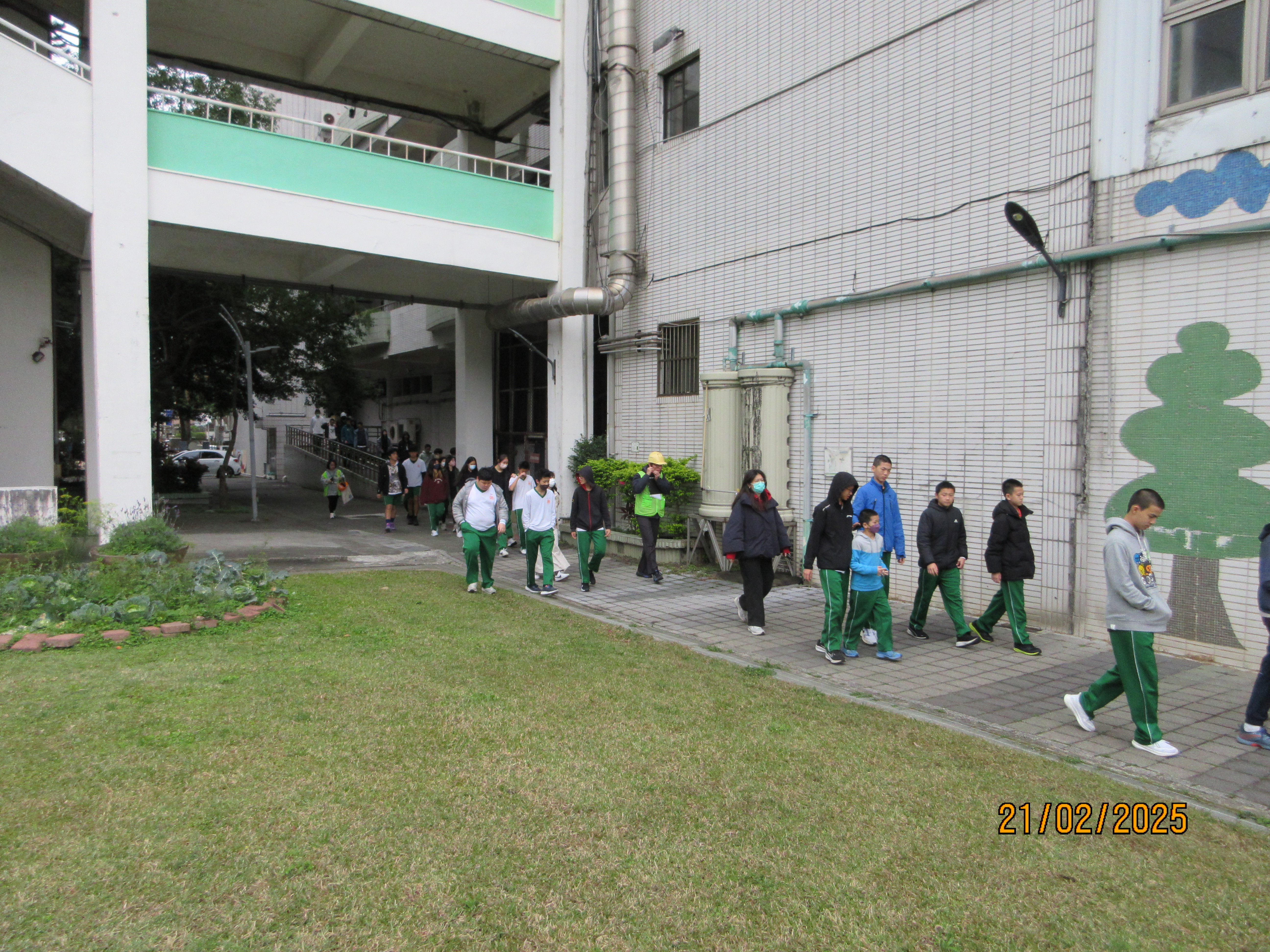 接續實施5分鐘疏散集合演練(時限內藉由避難引導人員指引,協助全體同仁及師生依本校避難路線圖,以不語、不跑、不推之方式至集合場集合並完成人數清點)。
