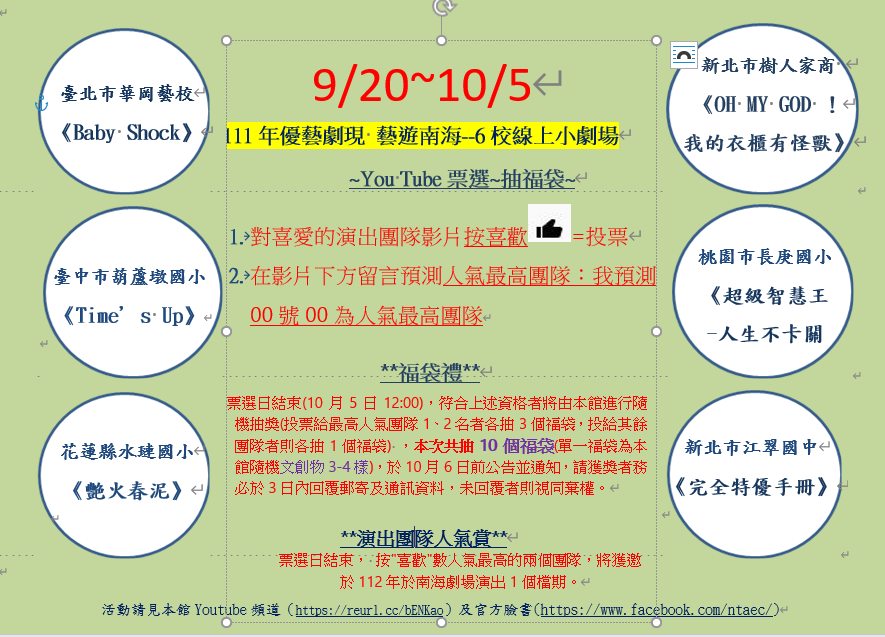 旨揭活動同時辦理最佳影片票選及送福袋等活動,活動詳 情請逕至該館官方臉書網站(https://www.facebook.com/ntaec/)查詢。