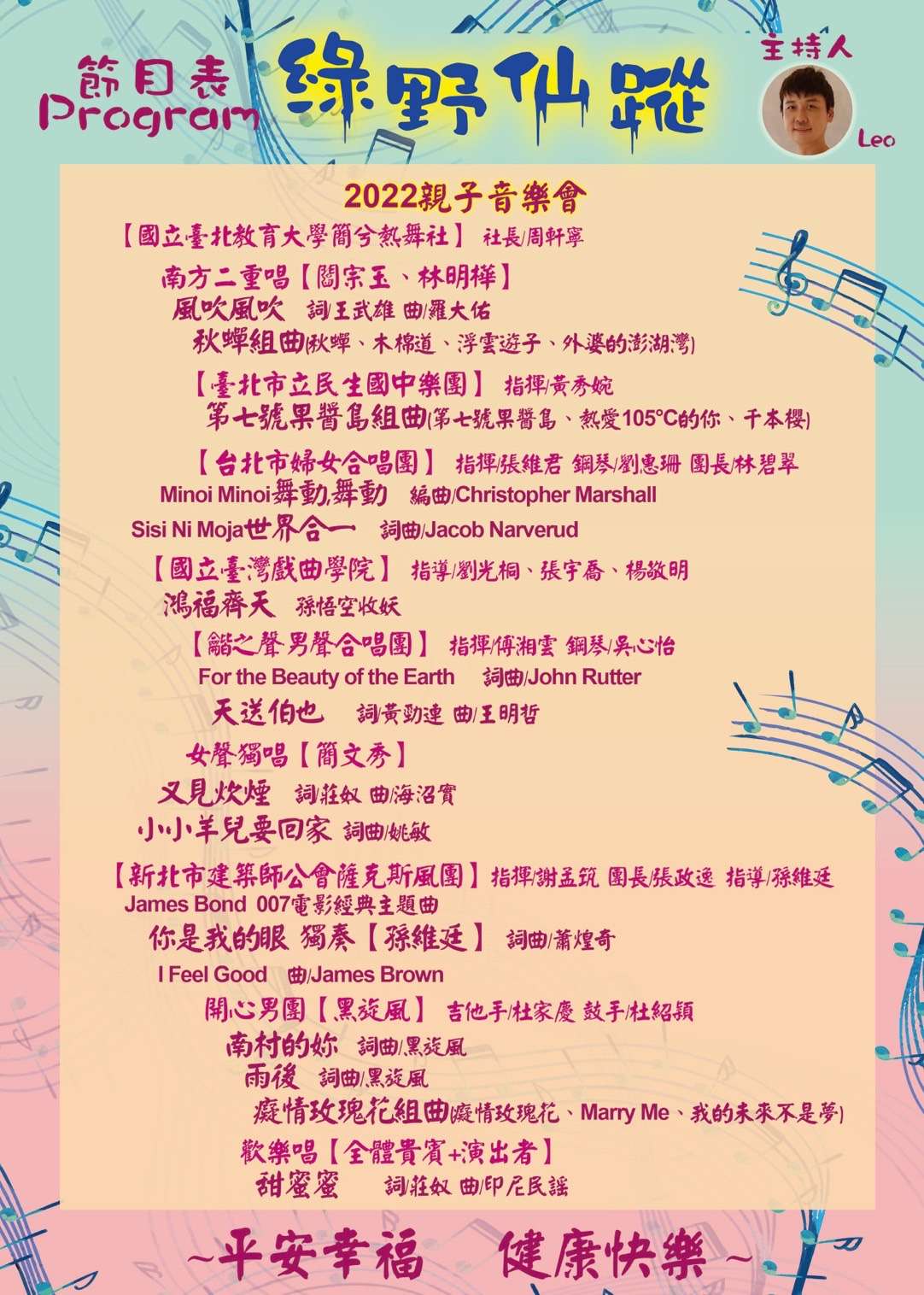 本次音樂會將邀請聲樂家簡文秀教授、 南方二重唱、孫維 廷、開心男團黑旋風、台北市婦女合唱團、國立臺北教育 大學簡兮熱舞社、國立臺灣戲曲學院、新北市建築師公會 薩克斯風團、臺北市立民生國中樂團及龤之聲男聲合唱團 等團體一同演出,是為一場親子同歡的音樂會。歡迎參加。