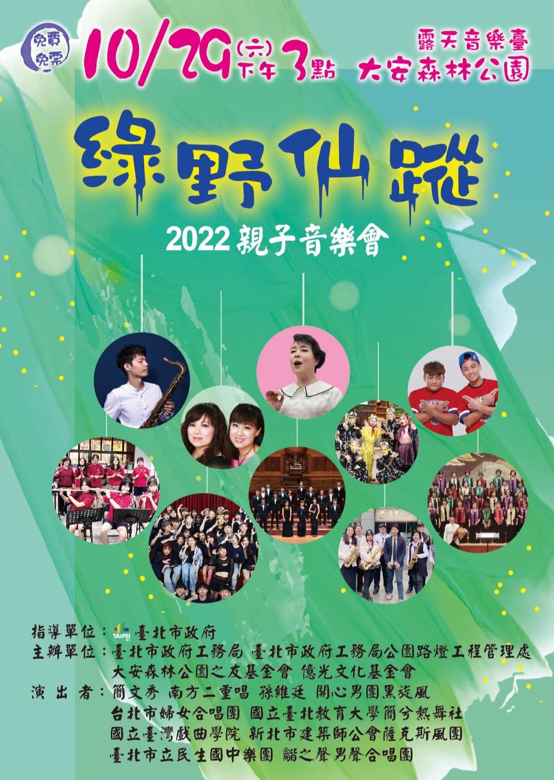 臺北市政府工務局公園路燈工程管理處與財團法人億光文化基金會及財團法人大安森林公園之友基金會訂於111年10月29日假大安森林公園露天音 樂台共同主辦旨揭活動。