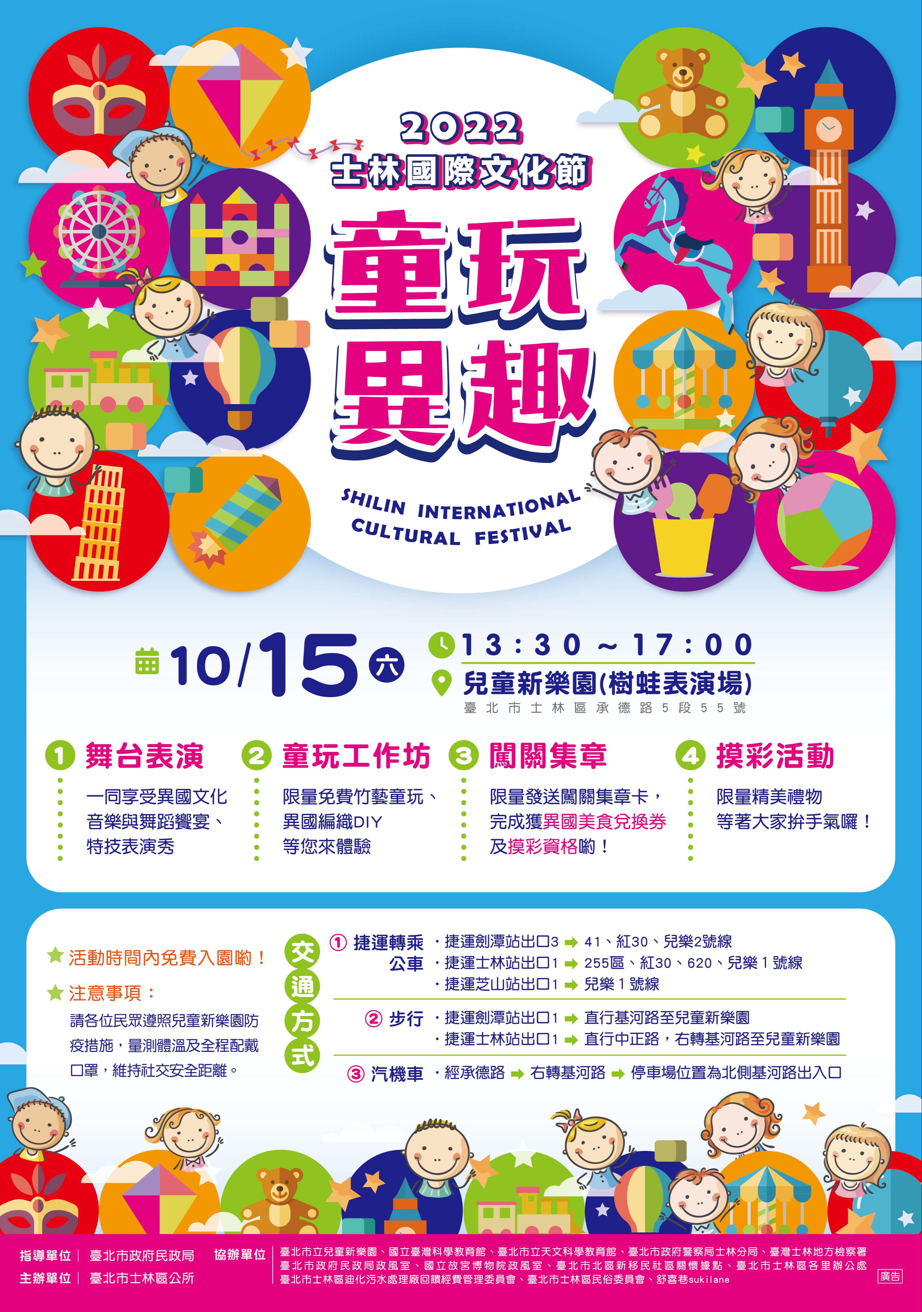 臺北市士林區公所將於10月15日(星期六)13時30分至17時假兒童新樂園舉辦「2022士林國際文化節—童玩異趣」活動,活動期間免費入園!