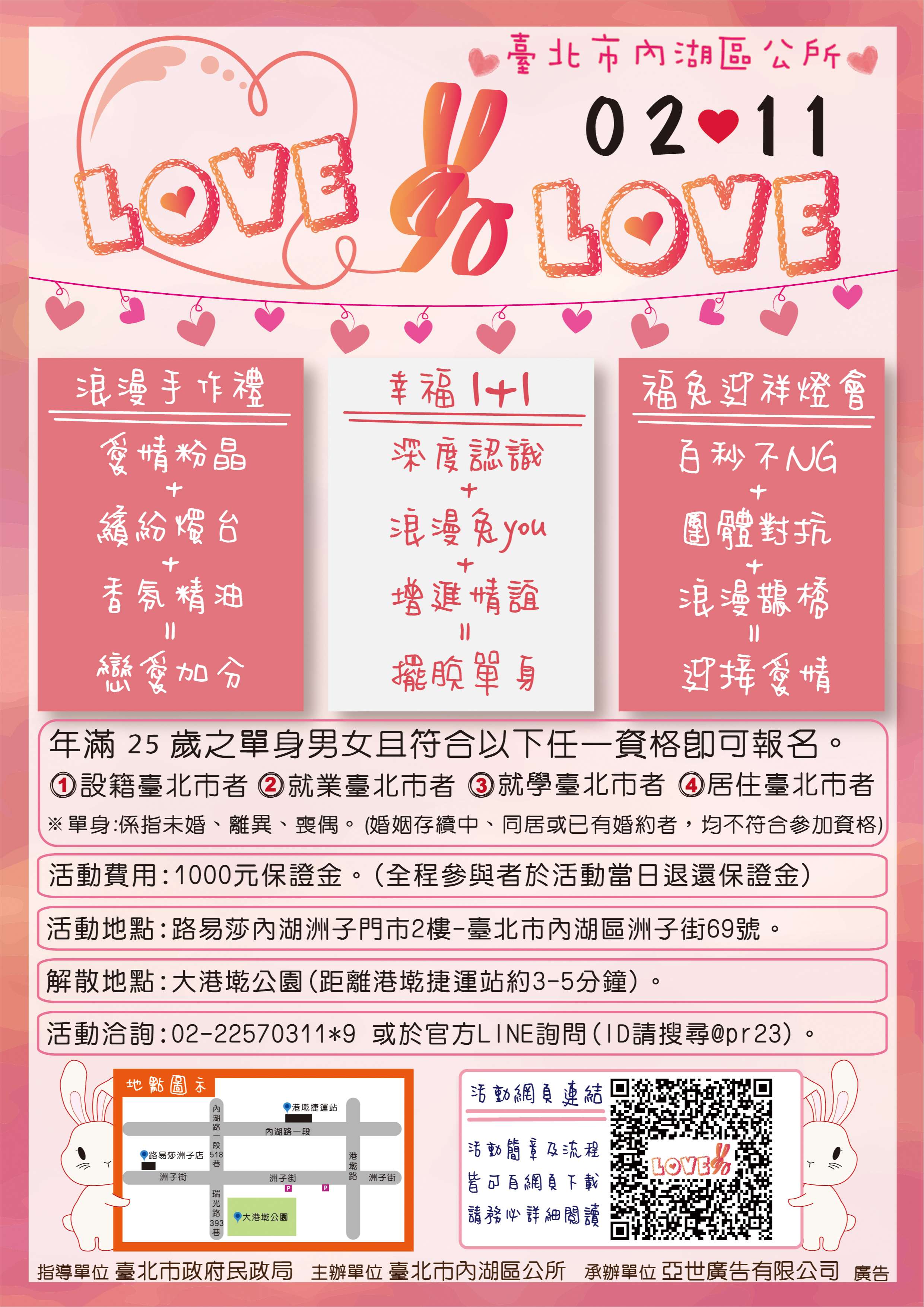 二、「臺北市內湖區公所將於112 年2月11日(六)下午12時30分至19時舉辦單身聯誼活動,活動名額為男、女性各20人,共40人,歡迎年齡年滿25歲 以上,設籍於本市或於本市就業、就學或居住之未婚市民踴躍報名參加,詳情請見內湖區公所官網最新消息或電洽 (02)27925828轉605內湖區公所洪小姐。」
