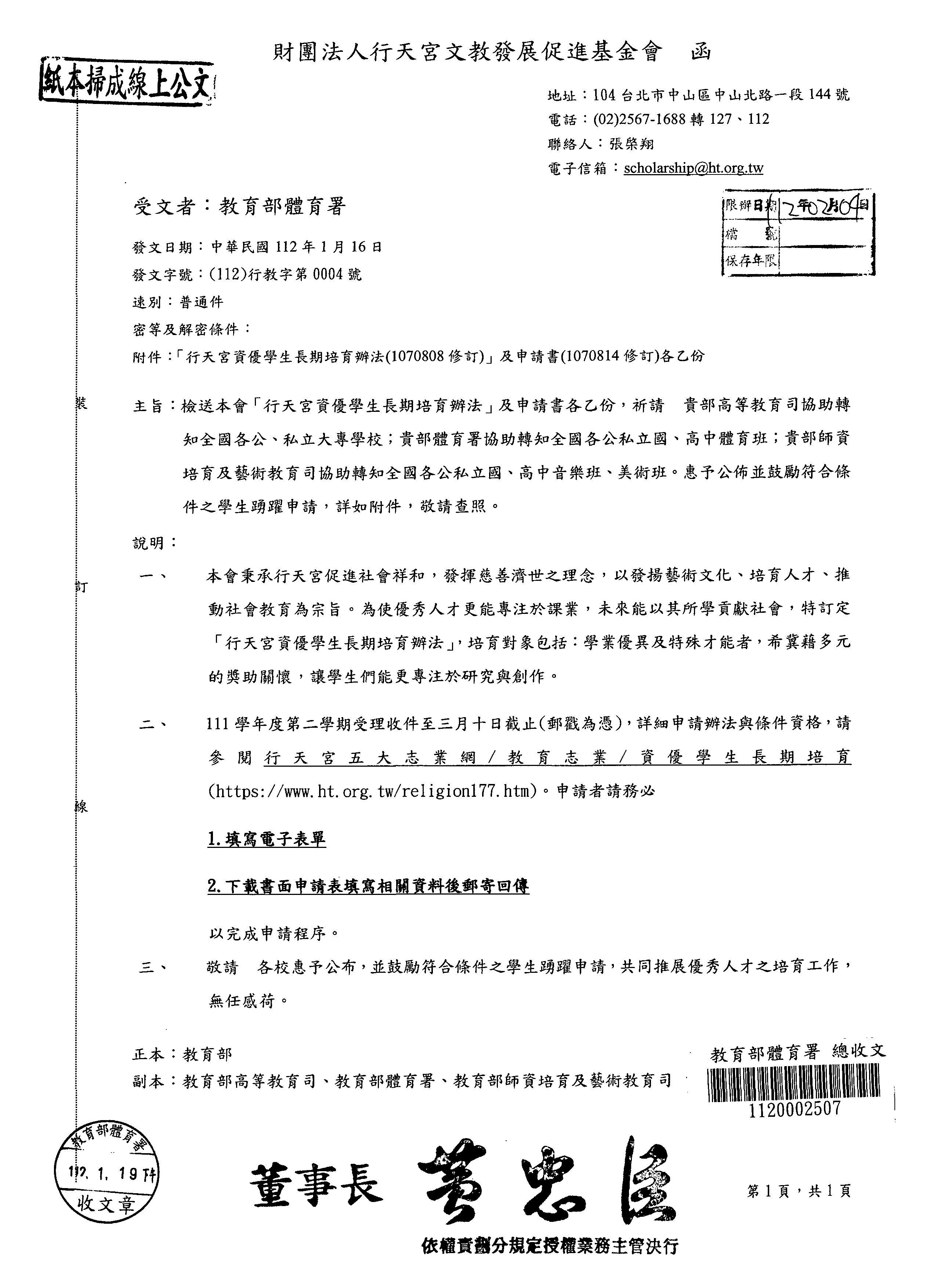 三、檢附財團法人行天宮文教發展促進基金會函文及附件各1 份。(詳如附加檔)