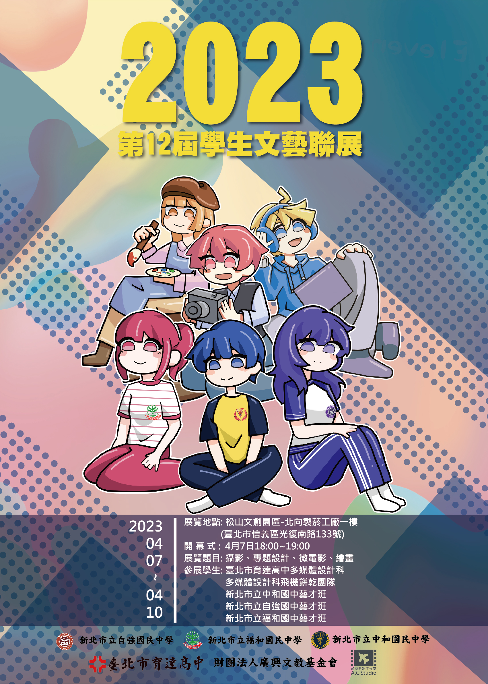一、活動說明:臺北市育達高中多媒體設計科與新北市立中和國中、新北市立自強國中、新北市立福和國中共同舉辦 「2023年第12屆學生文藝聯展」,活動邀請國中生線上報 名並完成打卡按讚就能體驗DIY熱轉印帆布袋製作,歡迎大 家前往參觀。