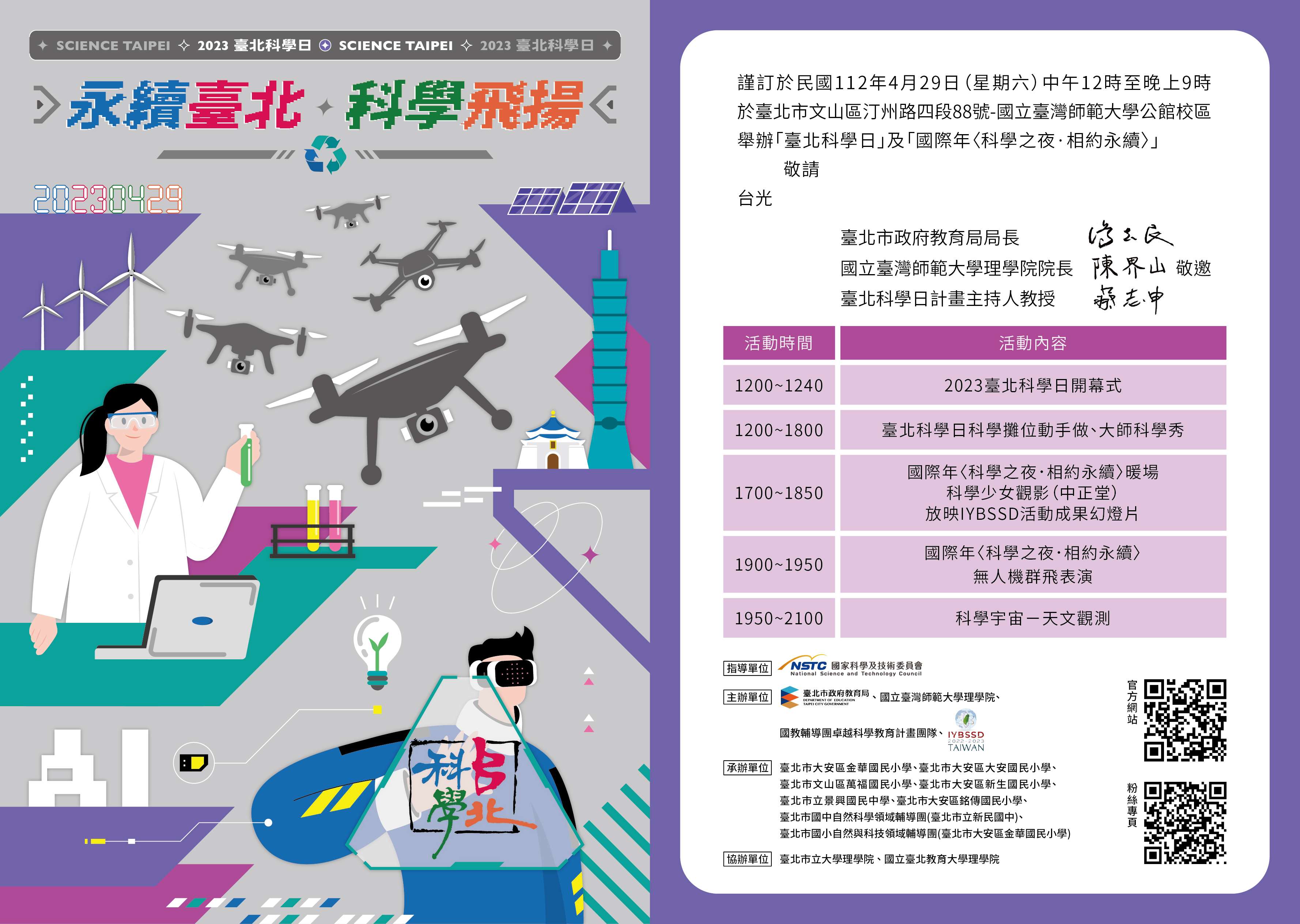 當日活動起訖時間為4/29(六)中午12時至晚上9時,內容包含開幕式、科學攤位動手做、科學少女觀影、無人機群飛表演以及天文觀測活動等;且由本市國小、國中、高中等學校參 與科學攤位設置達50處,內容豐富多元,檢附邀請卡及活動海報電子檔各1份。