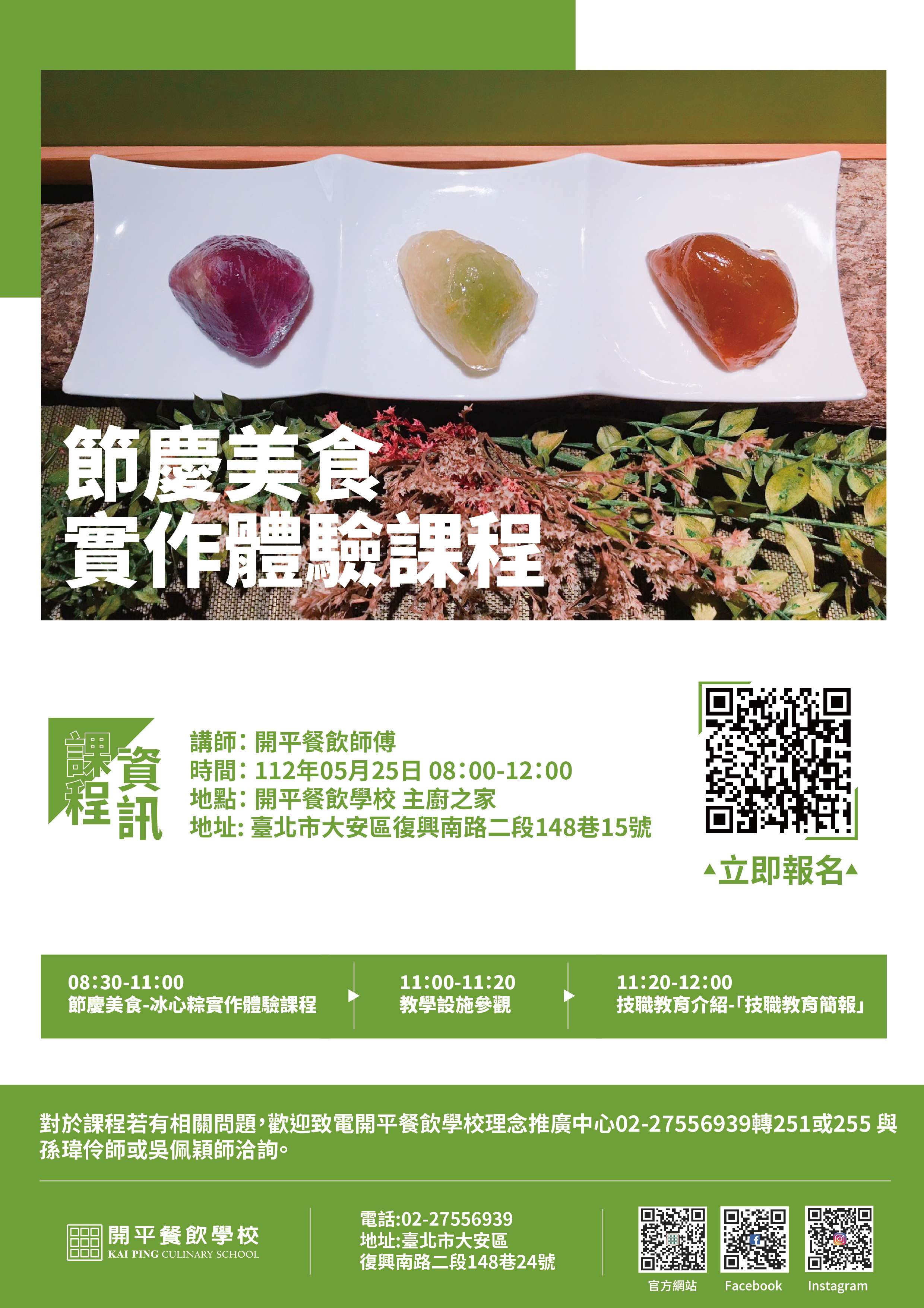 一、為協助國中教師認識技職體系之學習內容、教學特色及進 路發展。本次活動融入「節慶美食_端午節冰心粽」,透過 實作體驗更加了解技職體系,進而發揮協助學生適性就學 選擇之輔導。