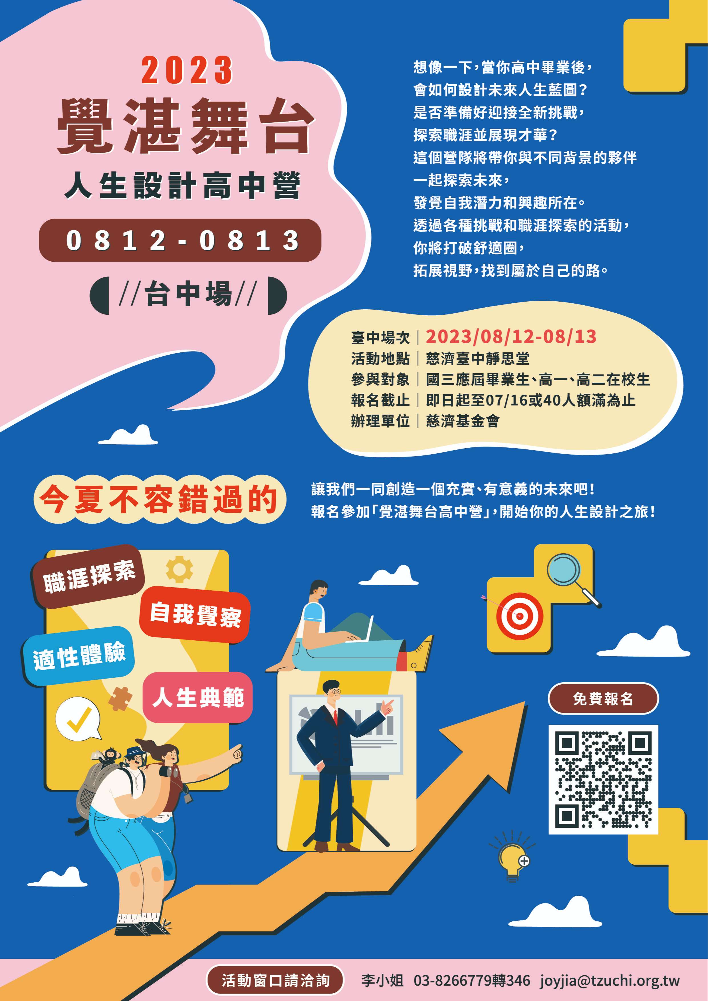 一、想像一下,當你高中畢業後,會如何設計未來人生藍圖? 是否準備好迎接全新挑戰,探索職涯並展現才華?這個營隊將帶你與不同背景的夥伴一起探索未來,發覺自我潛力和興趣所在。透過各種挑戰和職涯探索的活動,你將打破舒適圈,拓展視野,找到屬於自己的路。更棒的是,在 「覺湛舞台高中營」,還能擁有展現才華和創意的空間! 讓我們一同創造一個充實、有意義的未來吧!報名參加 「覺湛舞台高中營」,開始你的人生設計之旅!