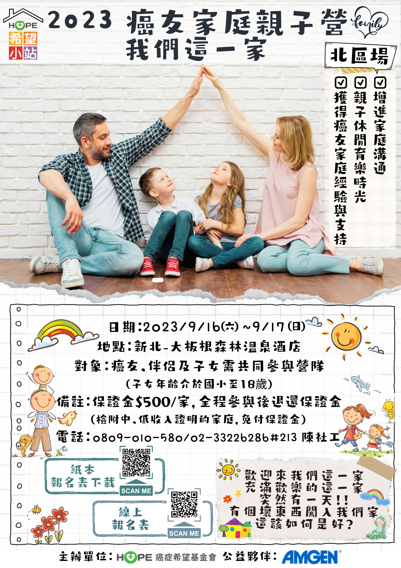 一、藉由親子營,協助罹癌父母理解孩子如何看待癌症,提供 親子溝通癌症訊息的平台與管道,增進親子對話的機會。 透過團體引導及討論的方式,促進親子溝通及互動,讓彼 此的「愛」得以在家庭中流動。