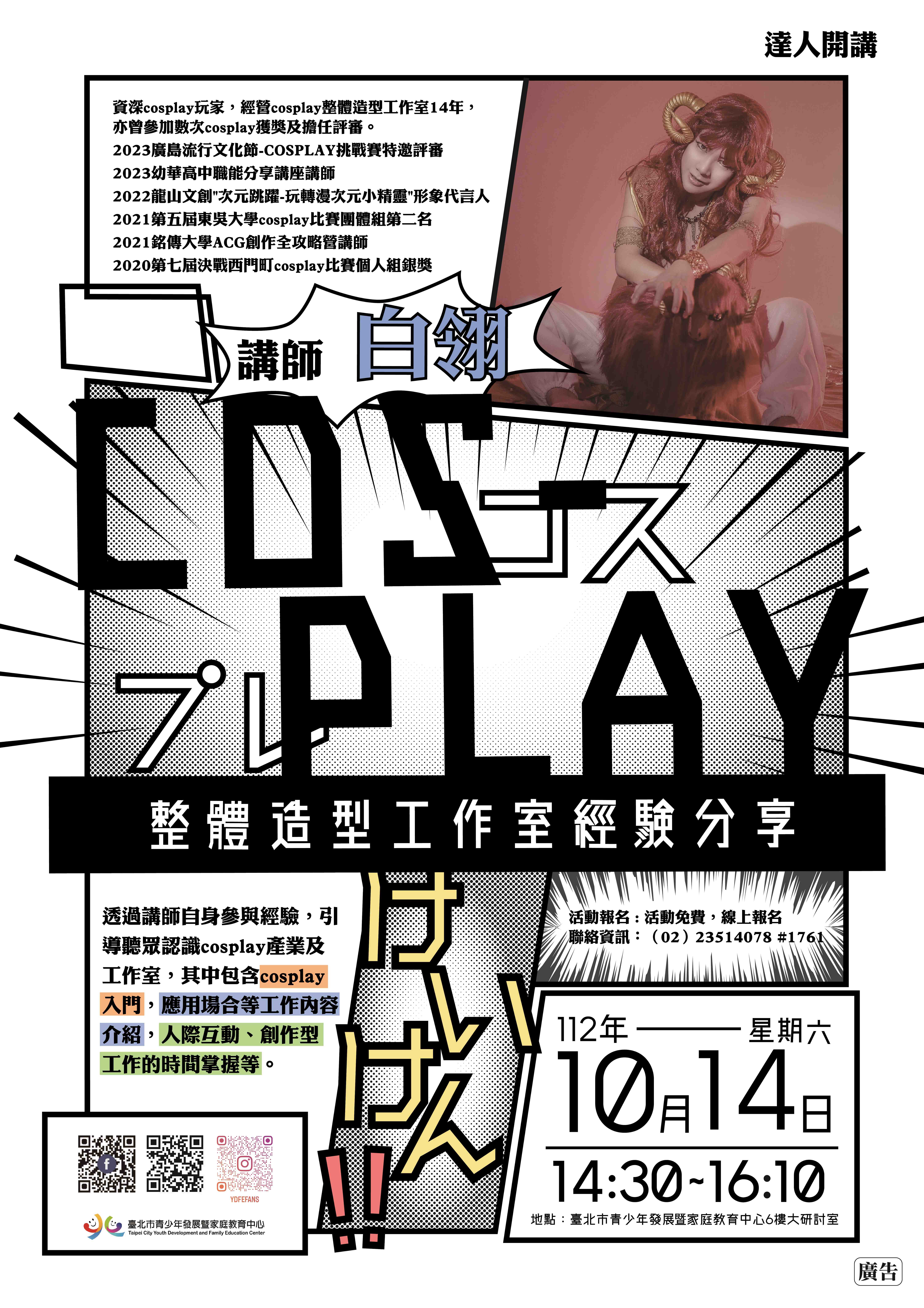 二、活動說明如下: (一)參加對象:青少年學子及一般民眾。 (二)活動時間:112年10月14日(星期六)下午2時30分至4時 10分。 (三)報名方式:網路報名(https://reurl.cc/edv05m)。(四)報名費用:免費。 (五)活動地點:臺北市青少年發展暨家庭教育中心6樓大研討 室(臺北市中正區仁愛路1段17號)。 三、宣傳稿內容如下: (一)90字:臺北市青少年發展暨家庭教育中心10月14日14:30 舉辦達人開講「Cosplay整體造型工作室經營分享」,白 翎老師與您分享她經營Cosplay整體造型工作室的心路歷 程,以及過程中的體驗。活動免費,詳見青發家教中心 官網。 (二)60字:臺北市青少年發展暨家庭教育中心10月14日14:30 舉辦達人開講:Cosplay整體造型工作室經營分享,白翎 與您分享她經營Cosplay整體造型工作室的日常;活動免 費詳見青發家教中心官網。 (三)30字:青發家教中心10/14白翎開講:Cosplay整體造型 工作室經營分享,活動免費詳官網。