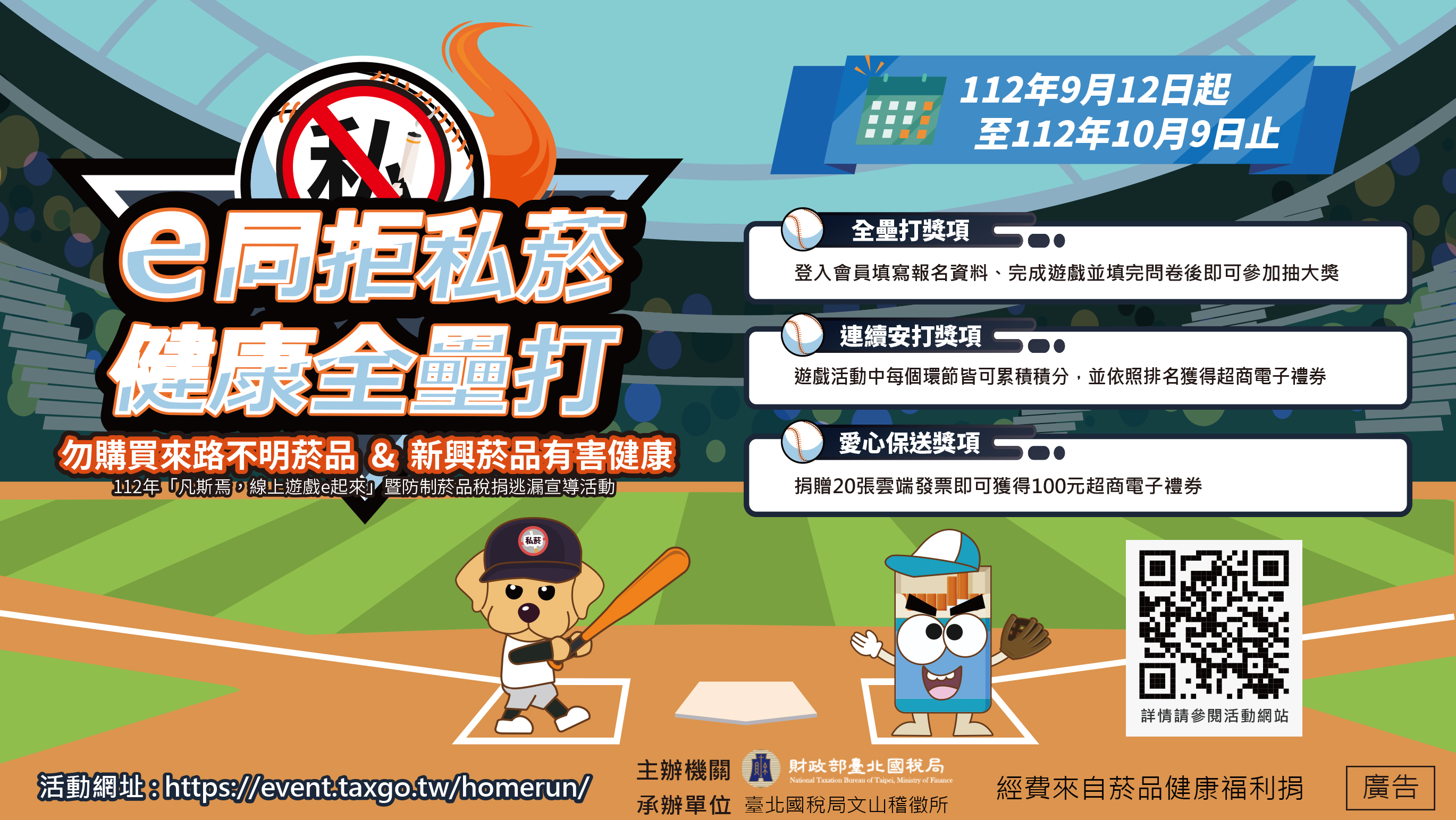 主旨:轉知財政部臺北國稅局112年「凡斯焉,線上遊戲e起來」 暨防制菸品稅捐逃漏之宣導活動,請轉知貴校教職員及師 生踴躍參加,請查照。 說明: 一、依據財政部臺北國稅局112年9月28日財北國稅文山服營所 字第1120804334號函辦理。 二、旨揭活動時間自112年9月12日起至112年10月9日24時止, 活動網址:https://event.taxgo.tw/homerun/。 三、檢附活動海報、活動獎項各1份。