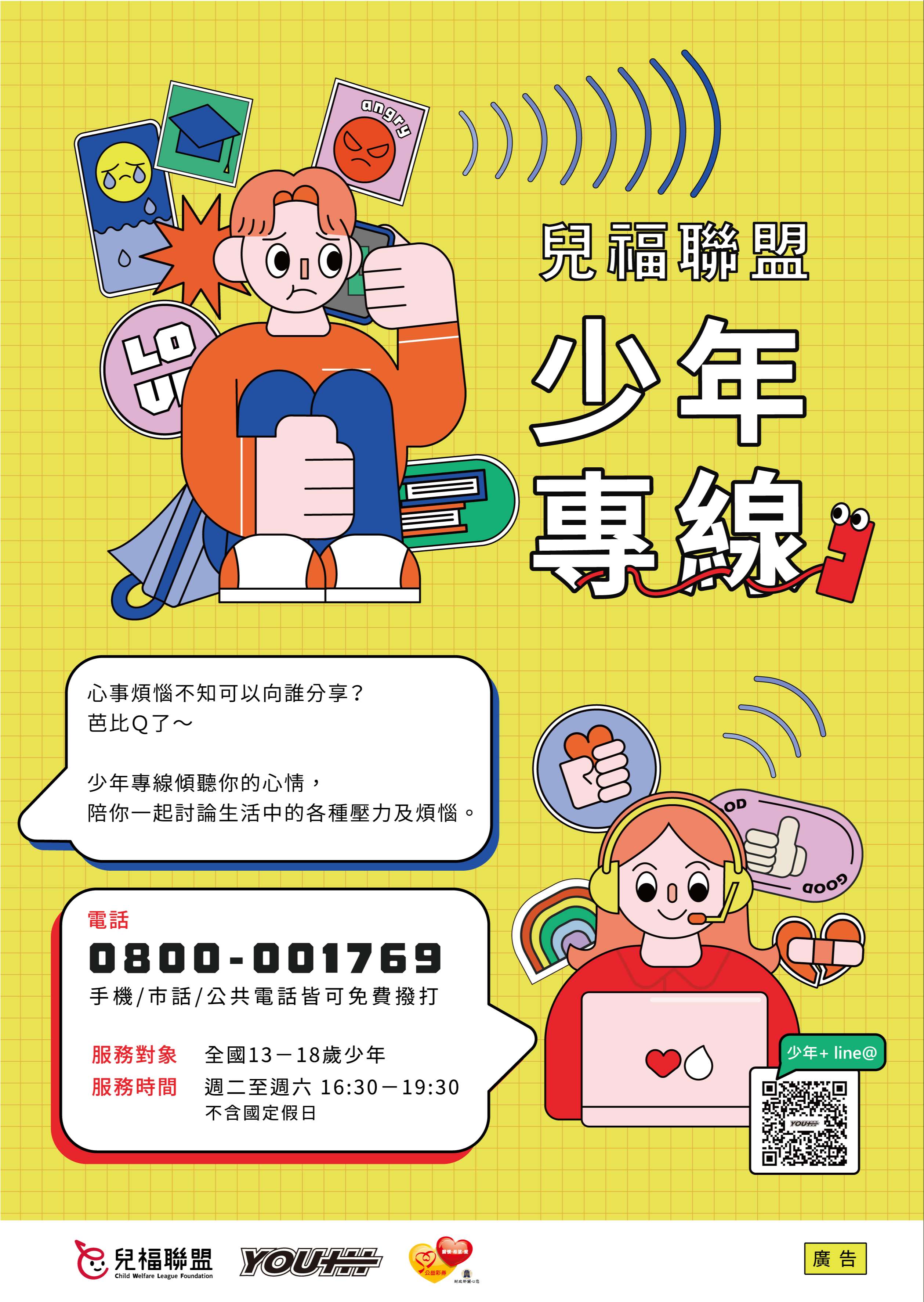 一、本會辦理「兒福聯盟-少年專線服務(0800-001769)」, 提供全台12歲至18歲之少年免付費電話諮詢服務,服務時 間為每週二至週六下午4:30至7:30。期待透過此專線傾 聽少年的需求,協助其抒發壓力,並引導、陪伴他們面對 和解決困難。