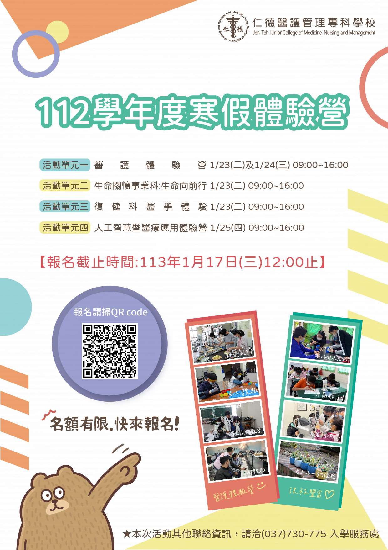 一、為提供國中學生選擇未來升學進路的參考,本校預定於113 年1月23日至24日舉辦寒假「醫護體驗營」活動,豐富的課 程內容除提供參與活動的學生及家長了解五專技職教育特 色及本校各科別的專業特色,也有助於學生選擇未來適合 就讀的升學科別及了解未來出路與發展。 二、本次「醫護體驗營」課程內容分為四大主題單位,學生可 依個人興趣選擇想要參與的課程,各單元活動概述如下, 詳細活動內容請參閱附件檔案或進入本校報名網站查詢。 活動單元一醫護體驗營:認識身體構造的奧秘,體驗生命的 奧妙,發揮身體的極限。 活動單元二生命、向前行冬令營:【生命你我他】及【一日 禮儀師】讓學生感受每一段生命階段的可貴與生命豐美之後的死亡。 活動單元三復健醫學營:什麼是核心肌群?透過物理治療師 專業的指導讓你免受姿勢不良和腰痛之苦。 活動單元四人工智慧暨醫療應用體驗營:體驗AI人工智慧與 醫療場域服務的學習。 三、凡參與本次活動的學生可獲得本校核發專業研習時數,此 一研習時數可取得本校五專免試入學自訂加分項目-[其他] 項目的積分,每一小時可獲得0.5分。歡迎鼓勵貴校學生踴 躍參加,爭取更多完全免試入學及聯合免試入學管道的積 分成績,提高進入本校相關科別就讀的機會。 四、寒假「醫護體驗營」活動線上報名網址https://forms.gle /ttExacWvTnfjFLkF9,歡迎鼓勵學生及家長踴躍參加。本 次活動其他聯絡資訊,請洽(037)730775入學服務處。
