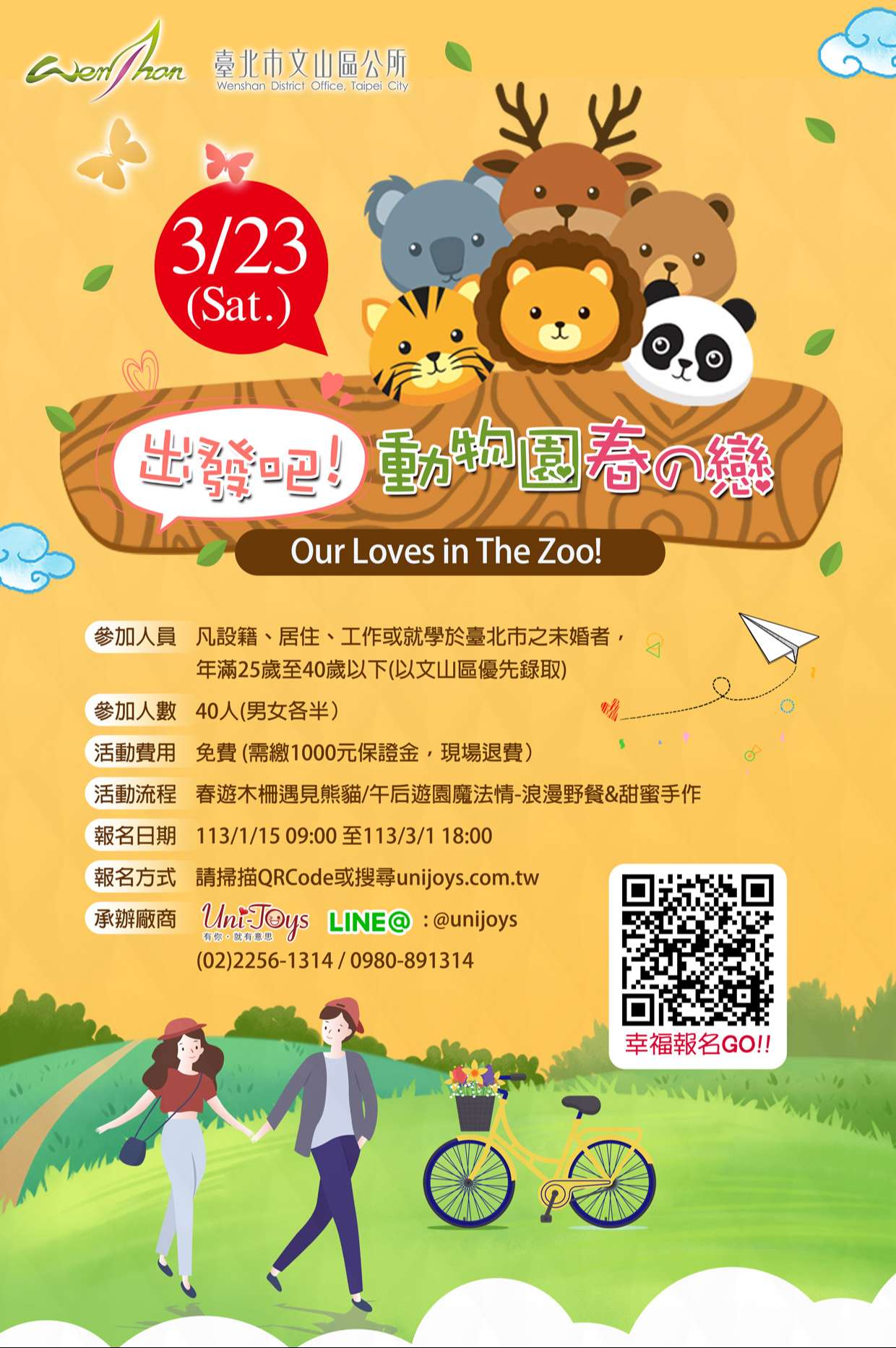 臺北市文山區公所113年度單身聯誼活動『出發吧!動 物園春の戀』,將於113年3月23日(星期六)下午13時至 17時假臺北市立動物園辦理,線上報名時間自113年1月15 日(星期一)起至113年3月1日(星期五)或額滿為止,凡 年滿25歲至40歲以下,總計40個名額,男女各20人,免費 參加,活動詳情請見該所官網或電洽2936-5522轉355吳小 姐。