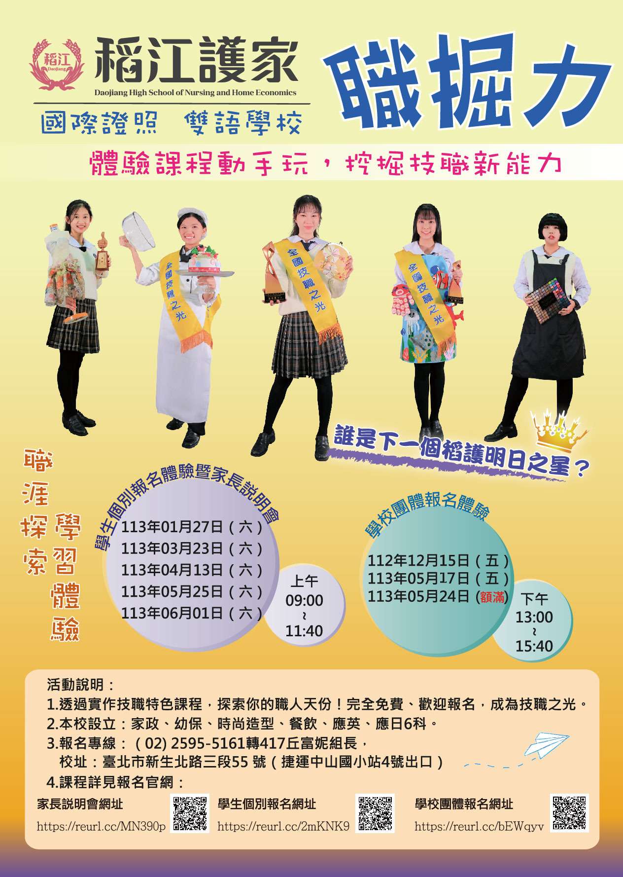 一、藉由實作體驗,增進學生及家長認識技職教育與職涯選擇 方向,以提供學生自我覺察與生涯探索,適性抉擇合適的 進路,以落實十二年國教適性揚才之教育目標。 二、本學期於113年3月23日(六)、4月13日(六)、5月17日 (五)、5月25日(六)、6月1日(六)辦理「稻江護家職掘力實 作體驗」,誠摯邀請 貴校八、九年級學生參加,並歡 迎 貴校教師或學生家長共同參與。 三、檢附活動報名表(含報名QR Code),為利於統計人數,敬請 於活動日一週前上本校網頁報名。 四、各校如欲於表列活動時間以外時段來校參觀,或有其他職 群體驗探索課程需求,請洽臺北市稻江護家技職試探組丘 富妮組長,電話:2595-5161,分機417。