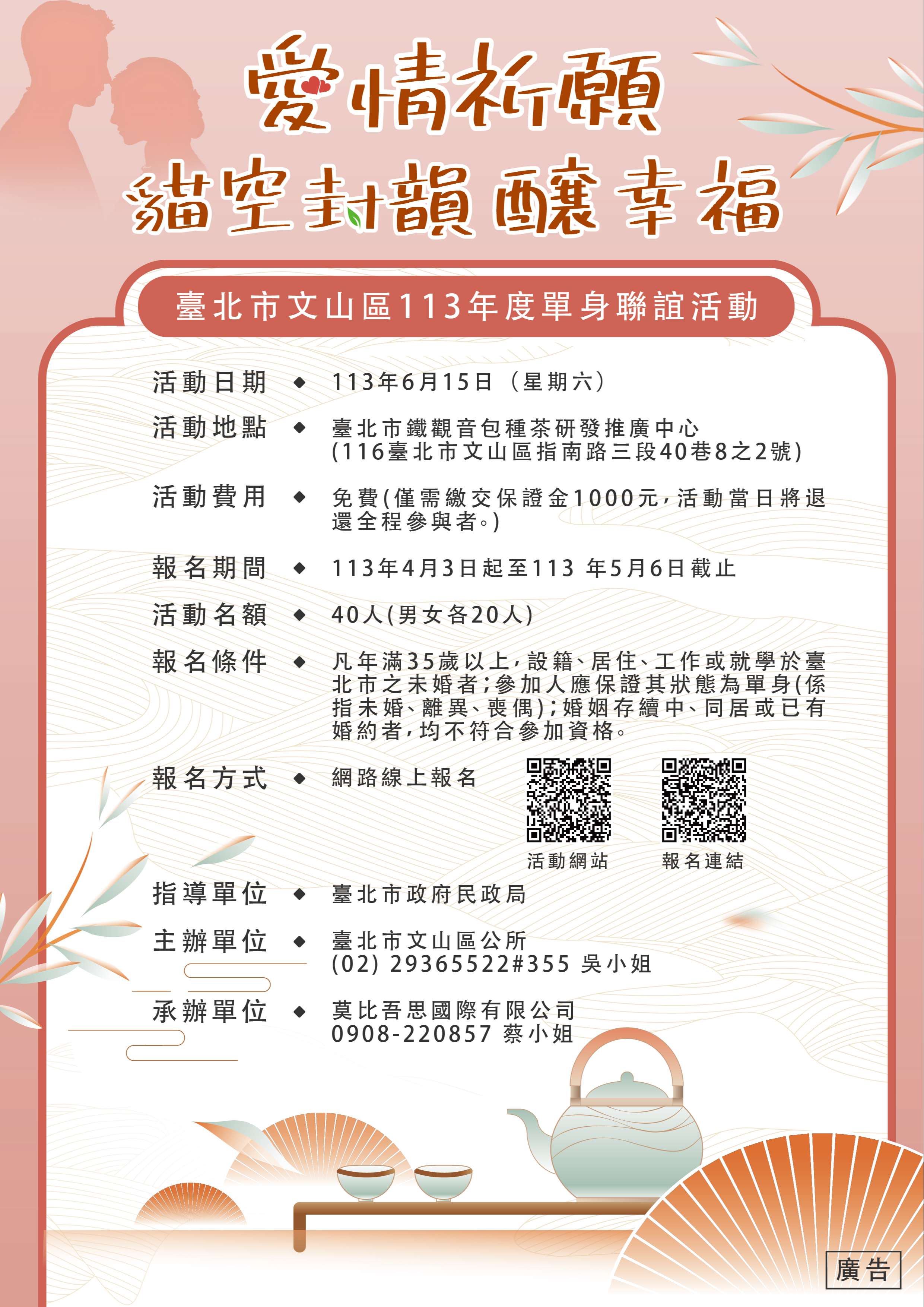 臺北市文山區公所113年度單身聯誼活動『愛情祈願~ 貓空封韻釀幸福』,將於113年6月15日(星期六)上午10 時至下午4時假臺北市鐵觀音包種茶研發推廣中心辦理,線上報名時間自113年4月3日(星期三)中午12時起至113年5月6日(星期一)下午2時或額滿為止,凡年滿35歲以上總 計40個名額,男女各20人,免費參加,活動詳情請見該所官網或電洽2936-5522轉355吳小姐。」。