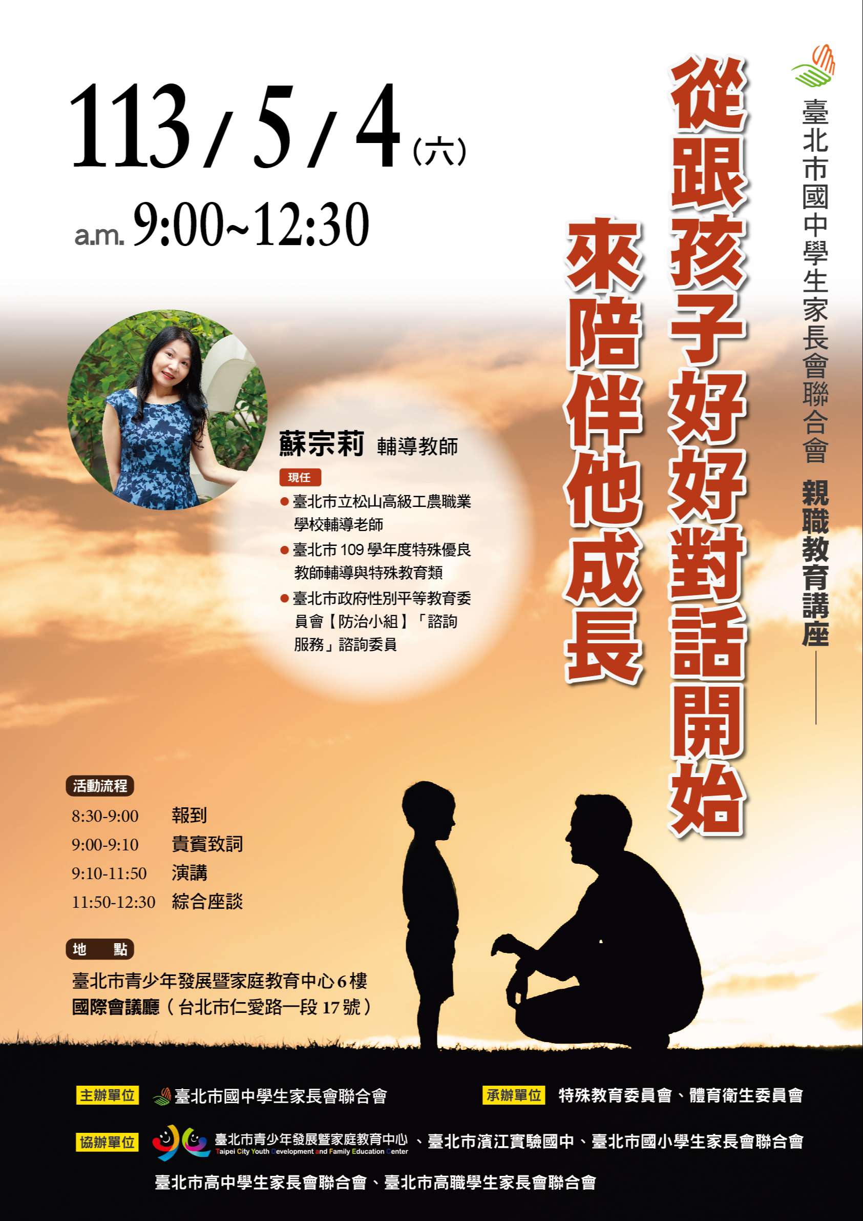一、講座以親子溝通為主題,讓父母正確了解自己和孩子的特 質,引導家長在生活中實際運用、檢視與調整,使教養孩 子的同時,也能更瞭解、接納及改變自己,建立幸福親子 關係。 二、講座資訊如下: (一)日期:113年5月4日(星期六) (二)時間:上午9時至中午12時30分 (三)地點:臺北市青少年發展暨家庭教育中心6樓國際會議廳 (臺北市中正區仁愛路1段17號)。 三、旨揭講座為免費參與,現場備有紙本講義及提供餐盒,可 透過Google表單https://forms.gle/bGLUnV9f6bndPefY7或 活動通網站https://www.accupass.com/event/24042604432796372447進行報名。