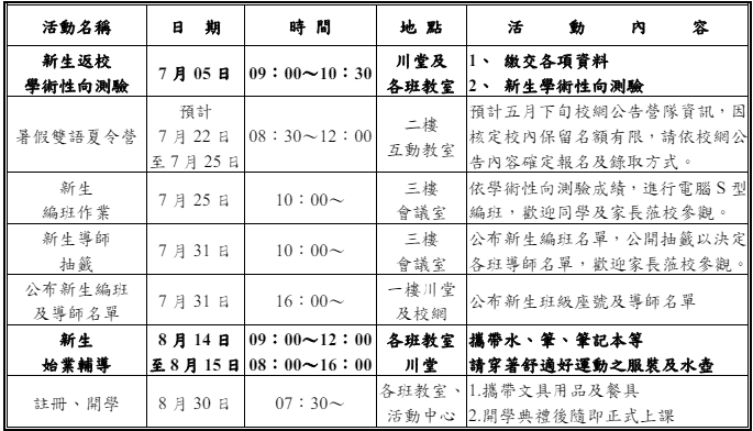 國七新生暑期相關活動摘要說明