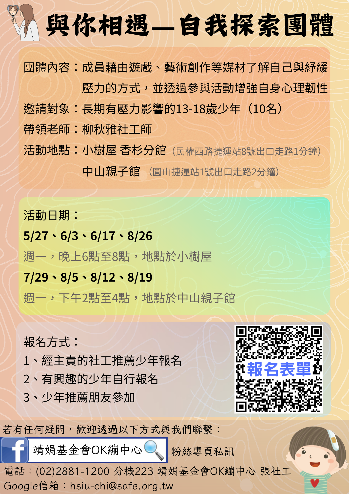 一、依據財團法人靖娟兒童安全教育文教基金會113年5月3日 113靖娟北總字第1130000195號函辦理。 二、該會期待透過辦理創傷少年自我探索團體,在團體支持與 具有創傷知情概念之團體領導者帶領之下,協助少年紓解 過去創傷或壓力經驗造成的心理傷害所帶來的影響,重新 建立安全與他人連結,也增加心理韌性。 三、內容說明: (一)113年5月27日、6月3日、6月17日及8月26日(週一)晚 上6時至8時,地點於小樹屋香杉分館 (二)113年7月29日、8月5日、8月12日及8月19日(週一)下 午2時至4時,地點於中山親子館。 四、檢附「與你相遇 自我探索團體」宣傳單張1份。