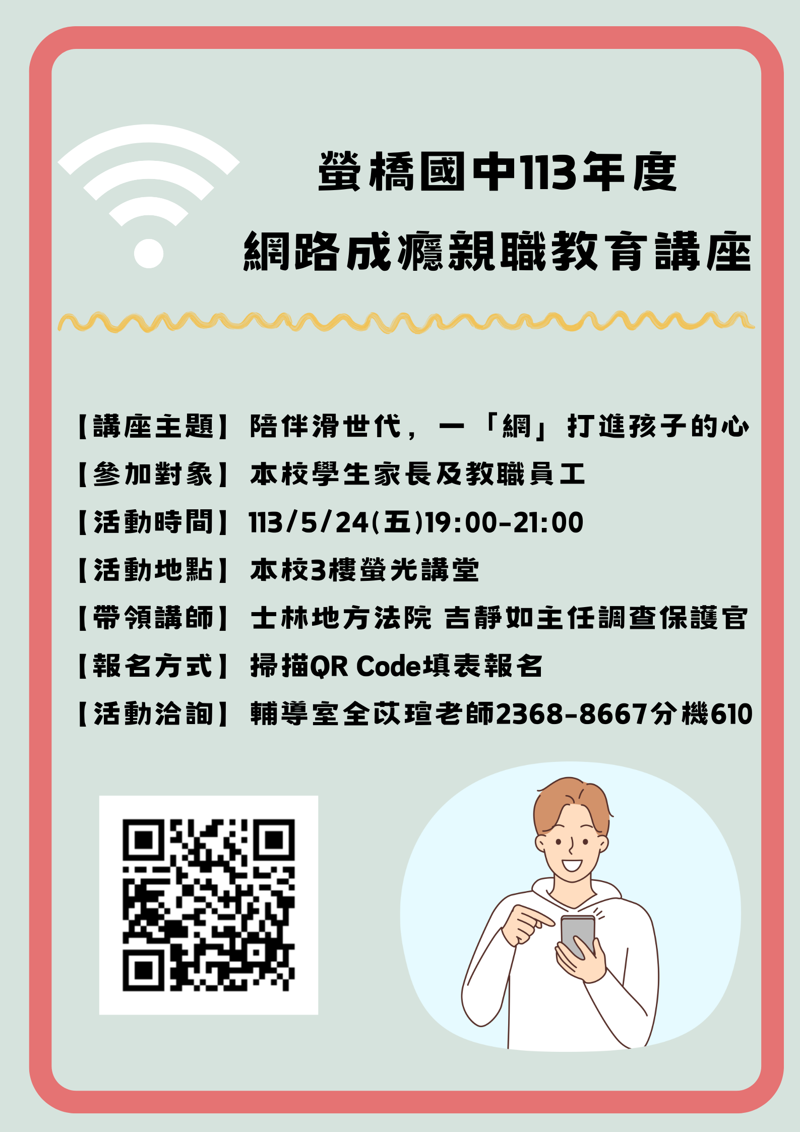 一、講座主題:陪伴滑世代,一「網」打進孩子的心 二、講座時間:113/5/24(五)19:00-21:00 三、講座地點:本校3樓螢光講堂 四、講師:士林地方法院 吉靜如主任調查保護官 五、報名對象:對此講座有興趣的家長、教師 六、報名方式:檢附活動海報(含報名QR Code),為利統計人數 以便安排活動,敬請於5/22(三)前填寫報名表單