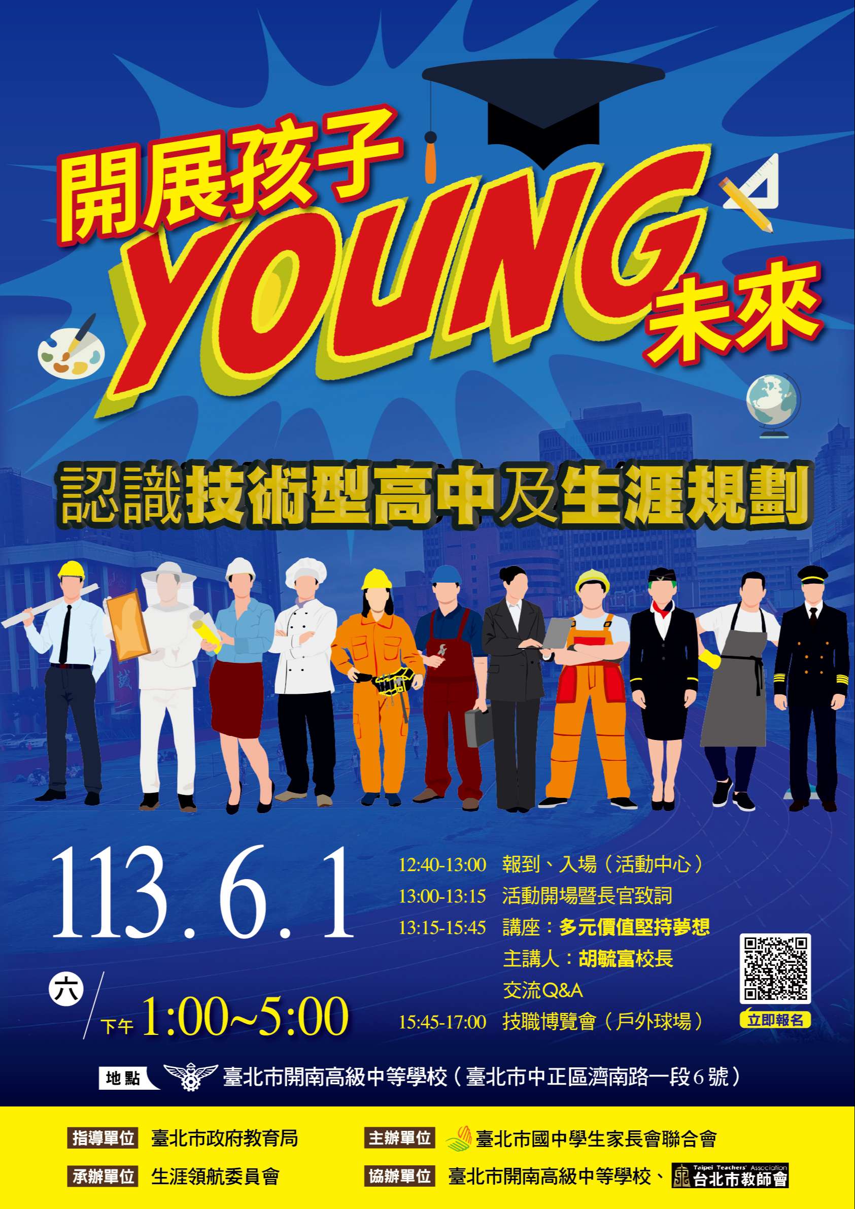 一、為提升學生及家長對技術型高中的認識,以利學生未來生 涯規劃,本市國中學生家長會聯合會辦理旨揭活動,活動 訊息如下: (一)活動日期:113年6月1日(星期六),下午1時至5時。 (二)活動地點:臺北市開南高級中等學校室內空間及戶外場 地(地址:臺北市中正區濟南路一段六號)。 (三)報名網址:https://reurl.cc/NQQK3n。 二、檢送活動資訊一份,請鼓勵貴校師生及家長參與,若有本 案活動相關問題,請洽臺北市國中學生家長會聯合會。