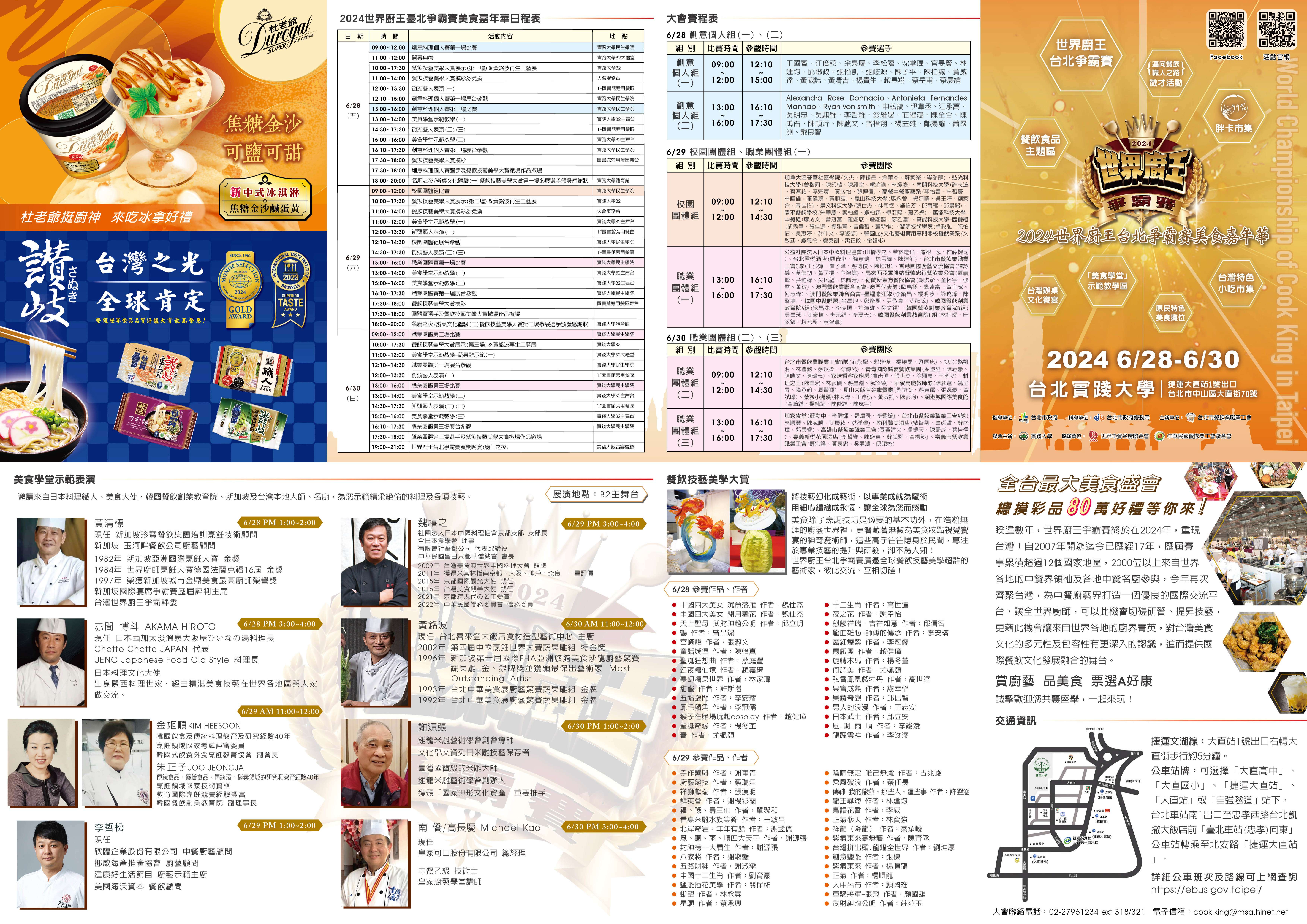 一、依據臺北市勞動局113年6月11日北市勞資字第11360746952 號函辦理。 二、為提升勞動者職業技能拓展國際視野,臺北市餐飲業職業 工會辦理「2024世界廚王爭霸賽暨美食嘉年華」,該活動 訂於113年6月28日至6月30日假實踐大學辦理。 三、本次世界廚王爭霸賽除規劃個人賽創意料理組、團體賽職 業團體組外,亦規劃有團體賽校園團體組,學生可透過參 與競賽,有助於在校期間累積國際競賽經驗,亦可瞭解餐 飲及相關產業之環境及未來發展;而本次活動除技能競賽 外,尚有靜態食材雕塑作品及動態廚藝示範表演等。 四、檢送活動宣傳DM電子檔及原函影本各1份。 五、倘有任何疑義,請逕洽臺北市政府勞動局丁良屹先生,聯 絡電話:02-27287007。