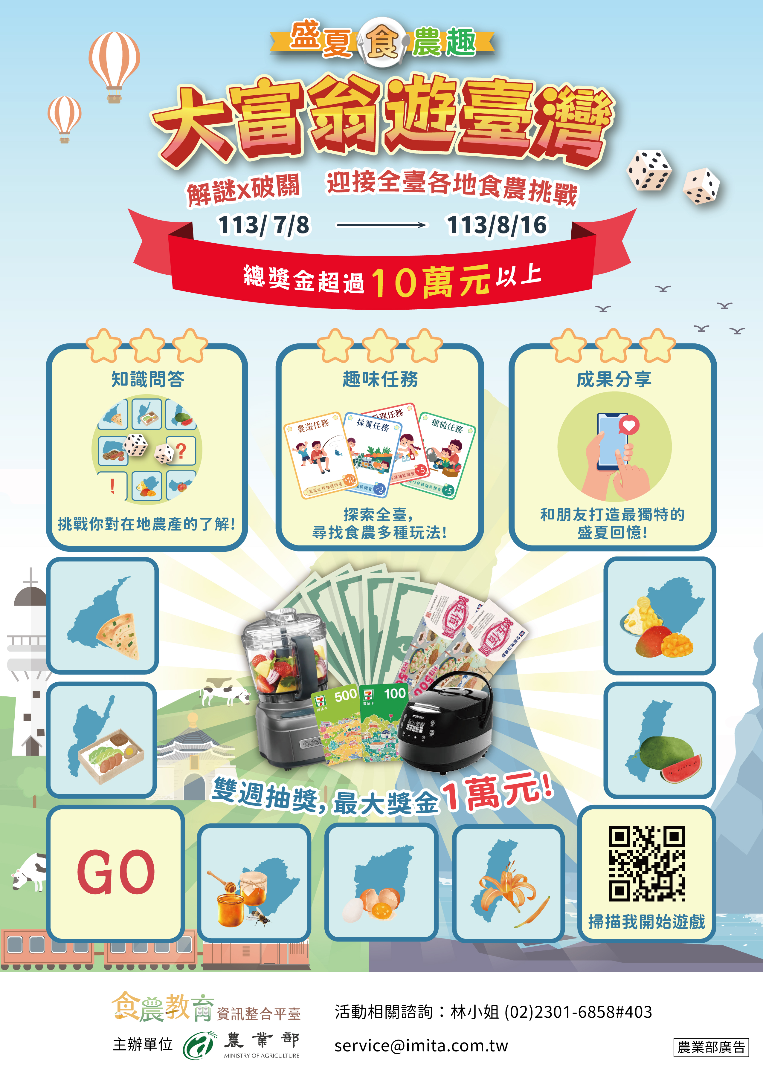三、為促使大眾更加瞭解食農教育,農業部訂於113年7月8日至 8月16日舉辦「盛夏食農趣:大富翁遊臺灣」食農教育推廣 活動(網址:https://fae.moa.gov.tw/2024event/),提 供食農教育相關知識問答、任務體驗與成果分享等遊戲參與活動即可抽獎,總獎金超過10萬元,有興趣者歡迎踴 躍參與。