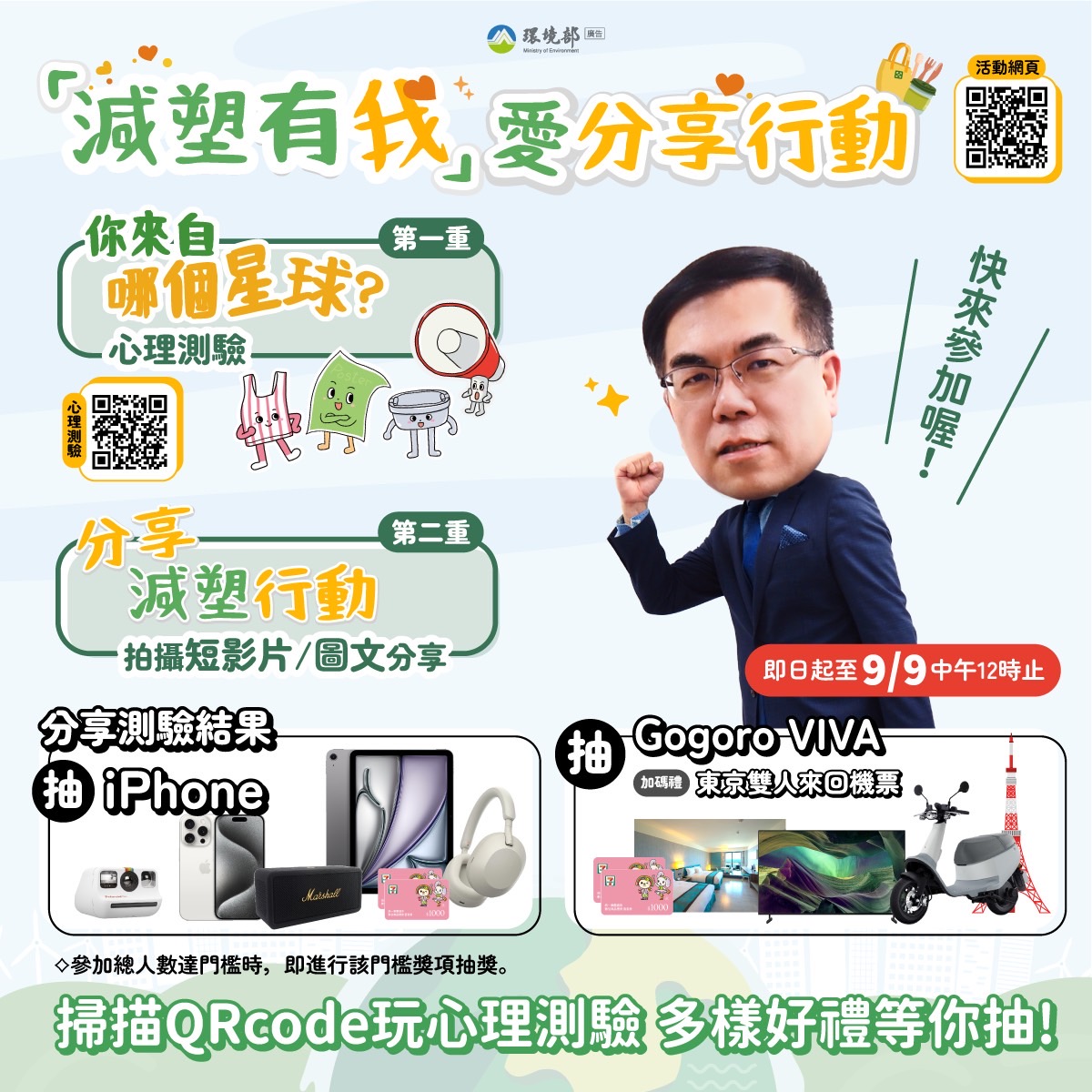 二、環境部為鼓勵社會大眾及莘莘學子一起跟上全球減少塑膠 的風潮,特辦理「減塑有我」愛分享行動,可透過臉書 (Facebook)、Instagram(IG)等社群媒體,拍攝個人生 活中減塑短影片、減塑生活照片,並可透過參加「你來自哪個星球?」心理測驗遊戲,瞭解並發覺屬於自己獨特的 環保行動,歡迎民眾邀請親朋好友一起在生活中響應減塑 行 動,參加旨揭活動拿大獎。