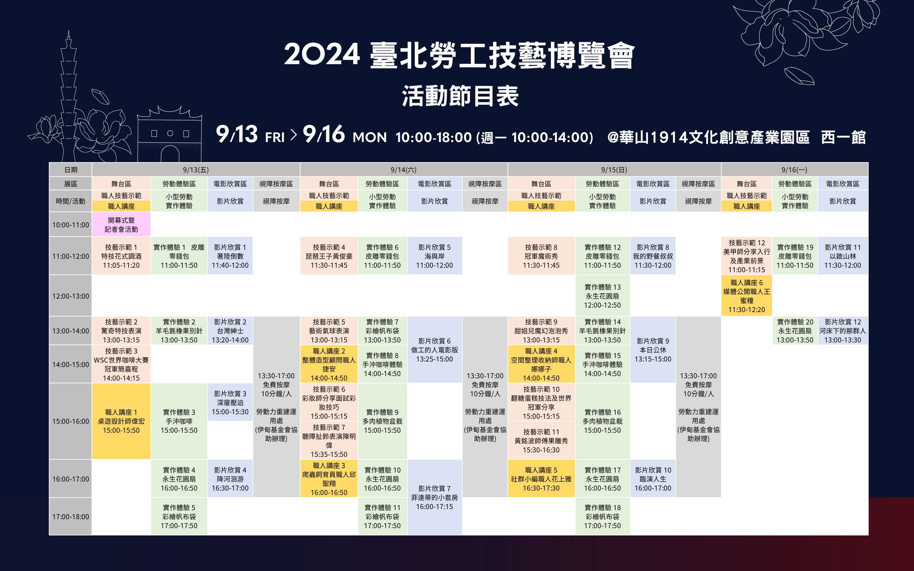 一、為傳承勞工技藝與彰顯職人精神,本局於113年9月13日至9 月16日假華山文創園區西1館(臺北市中正區八德路1段1 號)舉辦旨揭活動(免費入場),今年主題「技傳佰四, 藝氣風發」,響應臺北建城140週年,百工職人聯袂展現超 高技藝。 二、本活動共分為5大主題,包含14組職人靜態展、12部勞動影 片欣賞、12場精彩職人技藝表演、6場職人講座分享及20場 小型勞動實作體驗等多元豐富內容,邀請貴校師生一同共 襄盛舉,祈藉由本活動協助學生職涯探索並增強對勞動價 值之認同。 三、活動詳細資訊請詳本活動官網(網址:https://tplabor. tw/la03gfqRe)及本局勞動臺北臉書(網址:https://www.facebook.com/taipeilabornews)。隨文檢 附宣傳文案、活動節目表及海報圖檔各1份,紙本海報另行 郵寄,敬請貴校協助張貼於公布欄,並公布於官網向師生 宣傳並鼓勵踴躍參與,如蒙惠允,毋任感荷。
