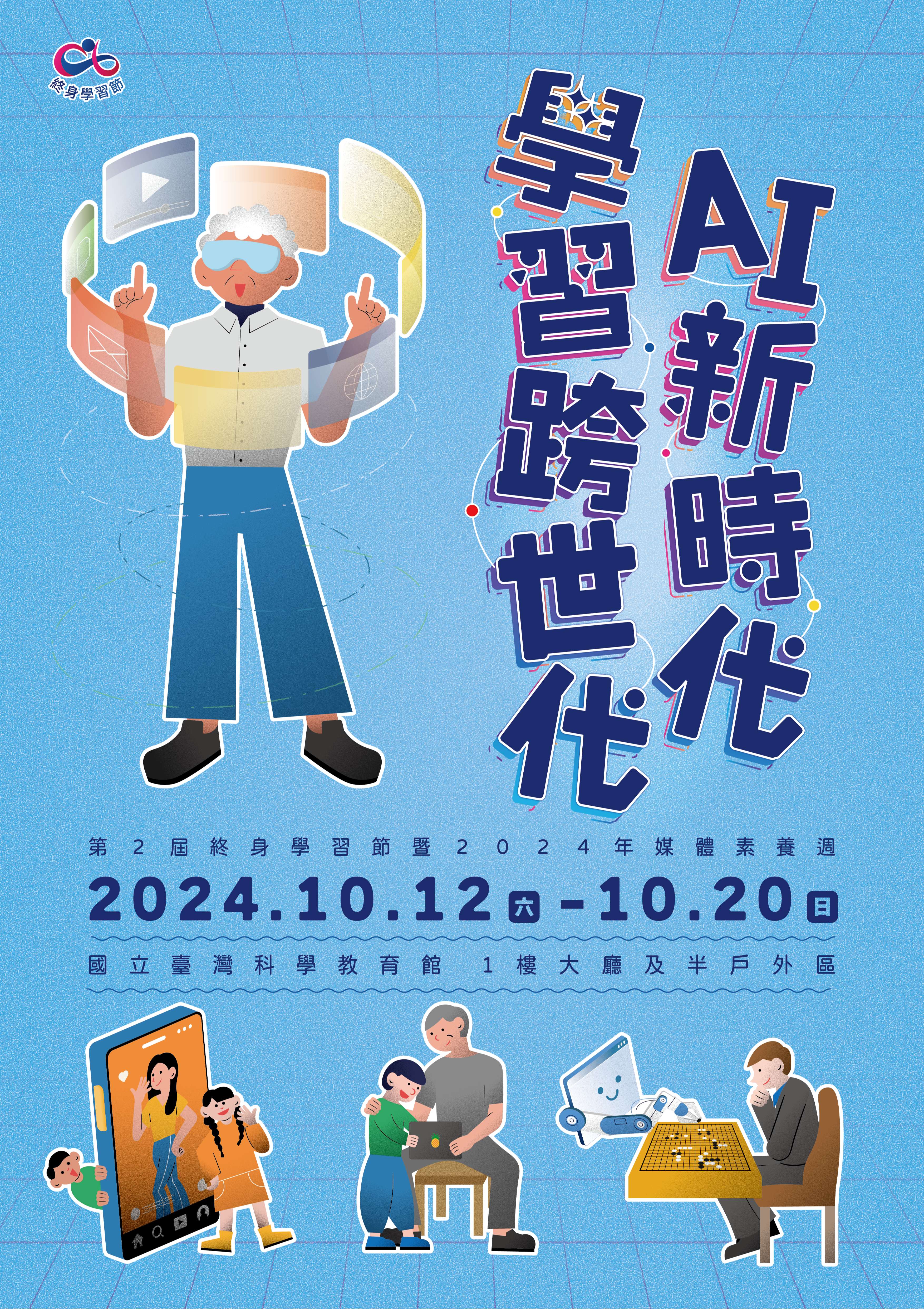 一、依教育部113年9月18日臺教社(一)字第1132403360A號函 辦理。 二、為強化國人對於終身學習之認知及行動力,以達110年3月 發布「學習社會白皮書」之「全民愛學習的臺灣-學習型 臺灣」願景逐步實現,教育部延續112年辦理首屆終身學習 節之基礎,特訂於113年(以下同)10月12日至20日於國立 臺灣科學教育館辦理「教育部第2屆『終身學習節』暨2024 年媒體素養教育週」。 三、本年度活動主題為「AI新時代,學習跨世代」,並規劃融 入「辨識假訊息、正確使用短影音、強化網路個資安全」 等媒體素養教育議題,其中動態活動主要集中於10月12日及13日兩天,包含:啟動記者會、頒獎表揚、終身學習表 演及集章市集、媒體識讀講座及劇場、媒體素養紀錄片及 講座與工作坊等多樣活動。 四、請貴單位透過相關管道周知鼓勵所屬人員及民眾踴躍參 與,併附活動流程及宣傳海報電子檔供參。 五、活動資訊若有需詢問事項,可洽承辦單位國立臺灣科學教 育館何小姐(電話:02-6610-1234轉1526)