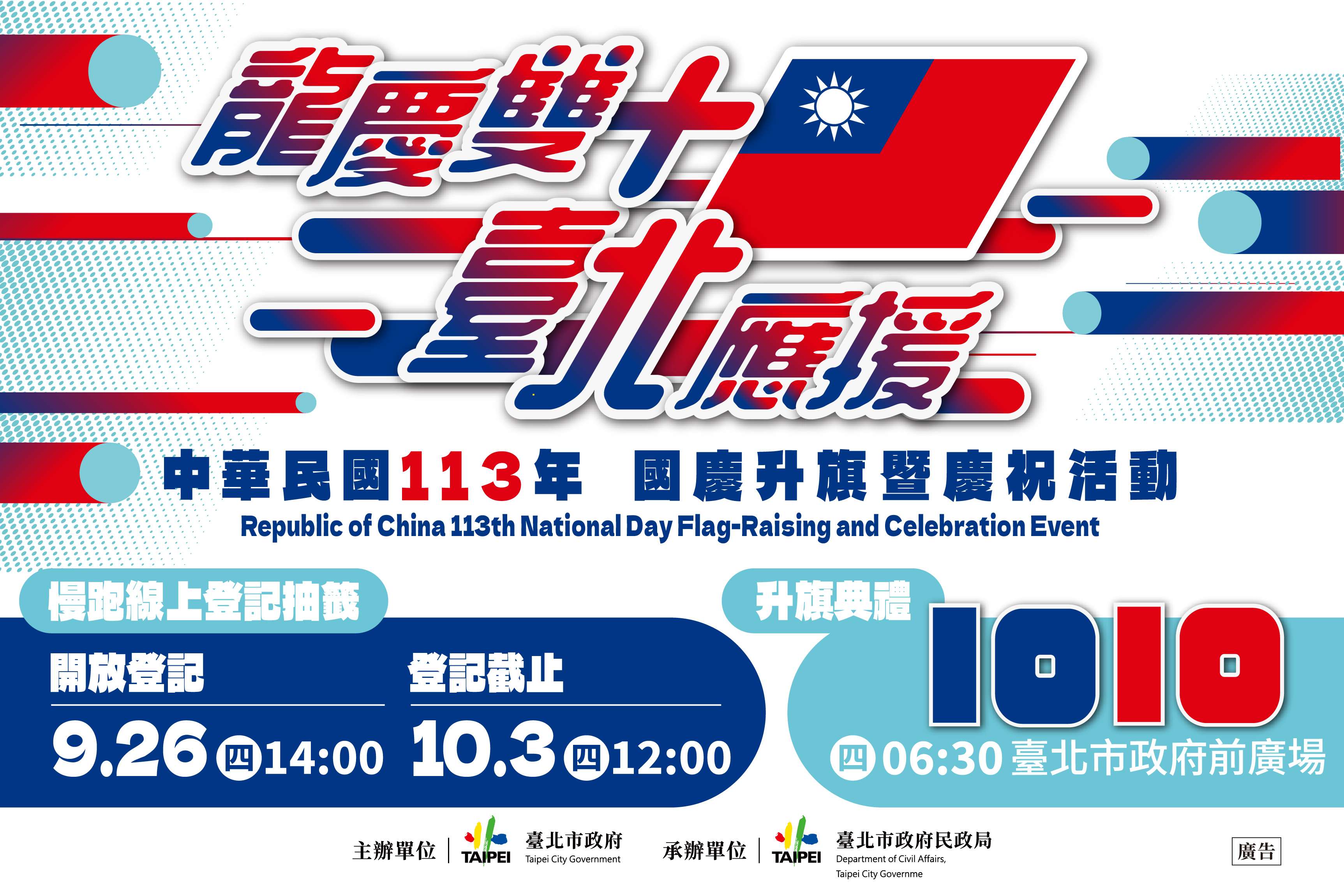 一、「中華民國113年國慶升旗暨慶祝活動」活動訂於113年10月10日(星期四)6時30分至11時於市民廣場辦理,今年規劃升旗典禮、表演活動、特色市集及慢跑活動,邀請市民一同響應全民運動,慶祝中華民國113年國慶。