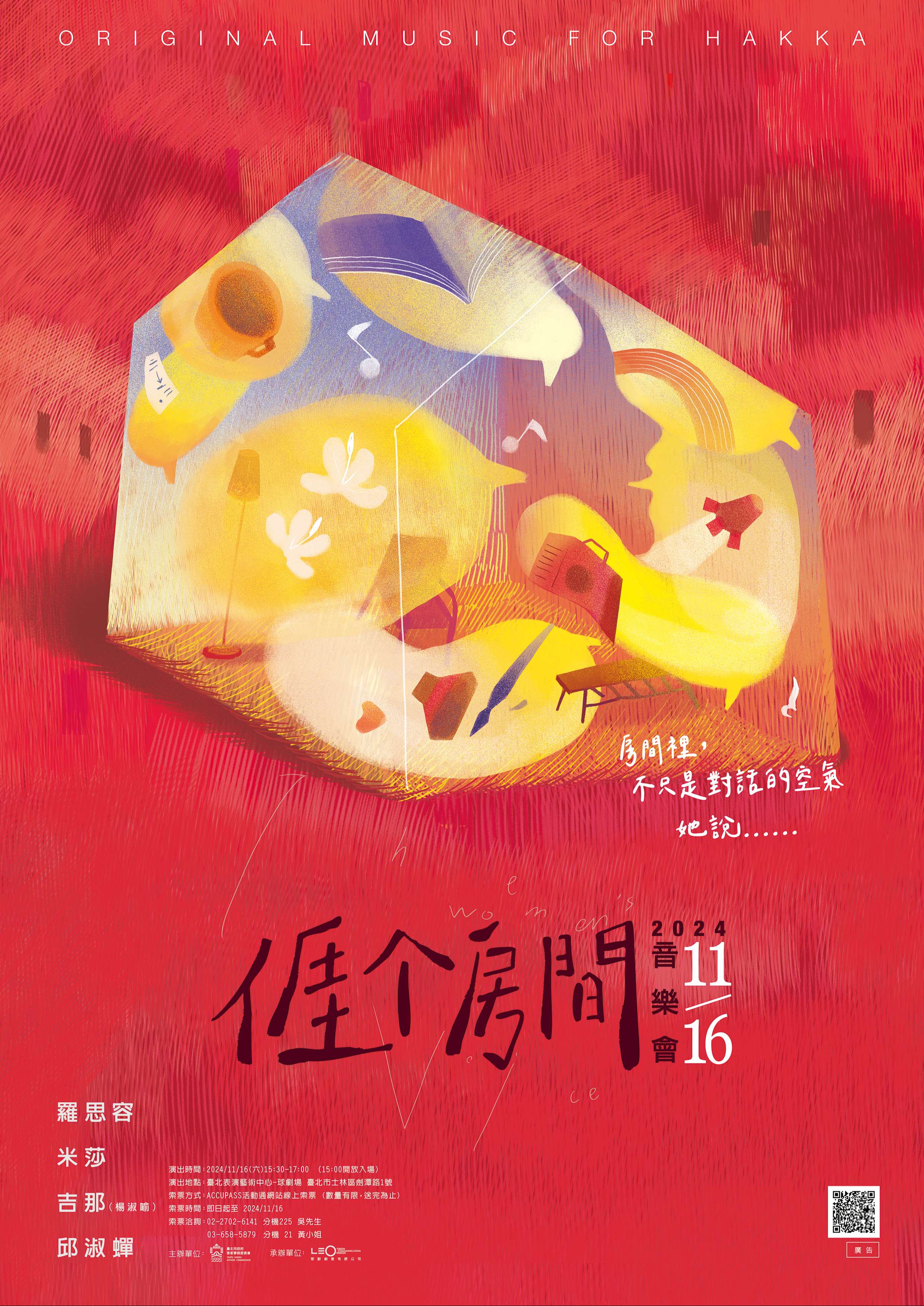 一、旨案今年以「客家女性的流變」為主軸,號召不同世代、 不同靈魂各自發光的8位受訪者,分享童年、家庭、社會、 人生經歷等多面向故事,期能以音樂的形式梳理出客家女 性的文化脈絡及不同世代的女性轉變,同時也觸及並涵納 同性婚姻與人工生殖等多元性別議題。 二、旨揭音樂會為描繪前揭受訪者的獨特生命姿態,特別邀請 客家流行音樂人羅思容、米莎、吉那、邱淑蟬創作歌曲, 另由金曲專輯製作人黃培育操刀製作,場地更選定臺北表 演藝術中心球劇場,以致力為觀眾呈現溫暖而觸動的音樂 饗宴,亦邀請觀眾探索客家文化與客家女性、客家多元性 別者之間的緊密關係。三、旨揭音樂會免費索票網址:https://reurl.cc/jyZj21;更 多精彩資訊請持續鎖定「臺北客家」或「臺北客莊音樂影 像故事」臉書粉絲專頁。 四、檢附旨揭音樂會海報1份。