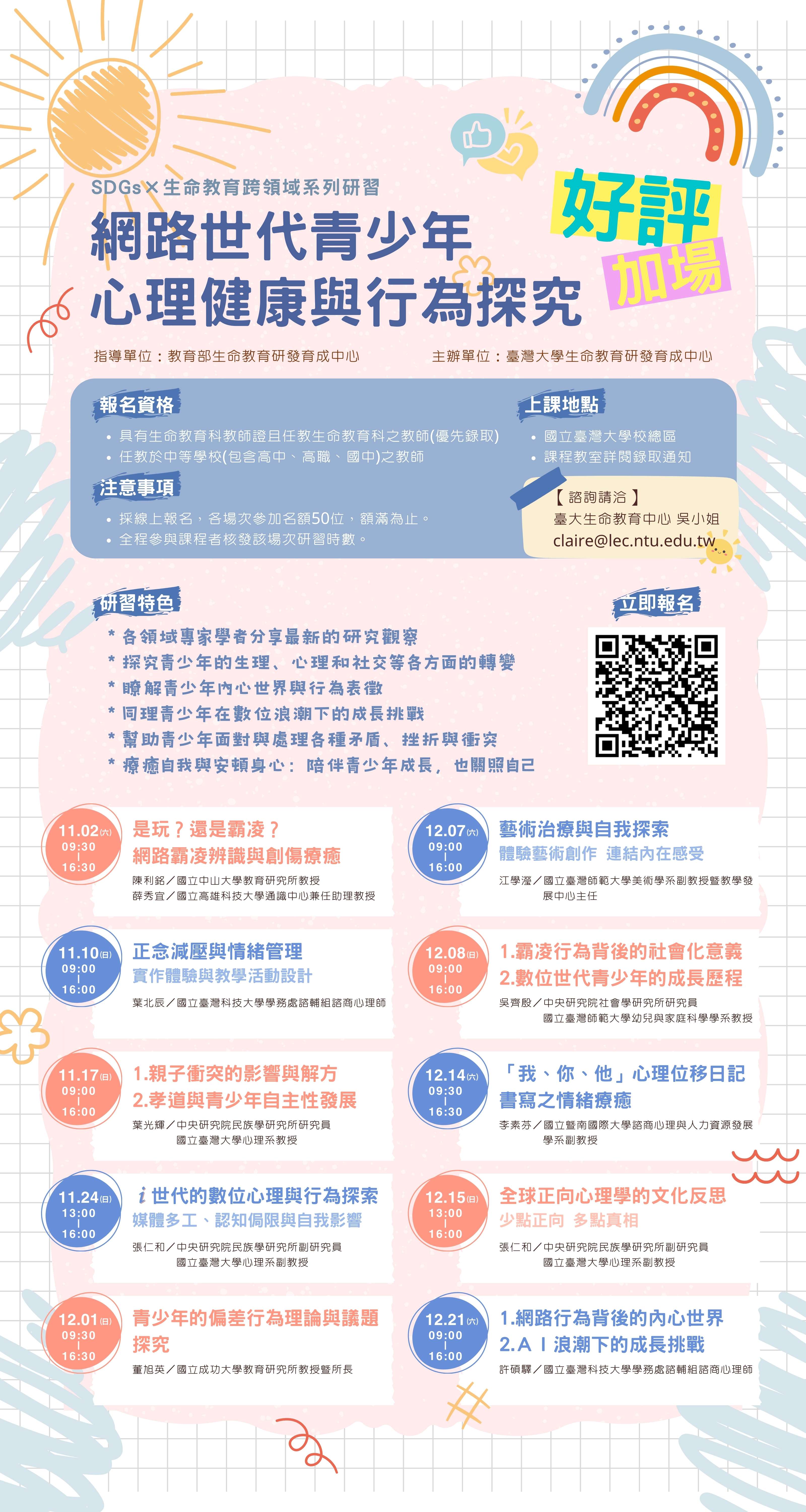 一、依教育部112年2月2日臺教學(一)字第1112807436號函辦 理,請貴校鼓勵所屬教師參與進修。 二、本研習規劃10個場次,詳細內容請參閱附件簡章及海報。 (一)研習場次: 1、11月2日(星期六):網路霸凌辨識與創傷療癒。 2、11月10日(星期日):正念減壓與情緒管理。 3、11月17日(星期日):親子衝突的影響與解方、孝道與 青少年自主性發展。 4、11月24日(星期日):i世代的數位心理與行為探索。 5、12月1日(星期日):青少年的偏差行為理論與議題探 究。 6、12月7日(星期六):藝術治療與自我探索。7、12月8日(星期日):霸凌行為背後的社會化意義、數位 世代青少年成長歷程。 8、12月14日(星期六):心理位移日記書寫之情緒療癒。 9、12月15日(星期日):全球正向心理學的文化反思。 10、12月21日(星期六):網路行為背後的內心世界、AI 浪潮下的成長挑戰。 (二)研習地點:本校。 (三)研習費用:全免,交通請自理或由學校酌予補助。 (四)參與對象:各公私立高中高職及國中教師。 (五)參與人數:各場次50-100人,額滿為止。 (六)官網報名:https://reurl.cc/ady2qQ。