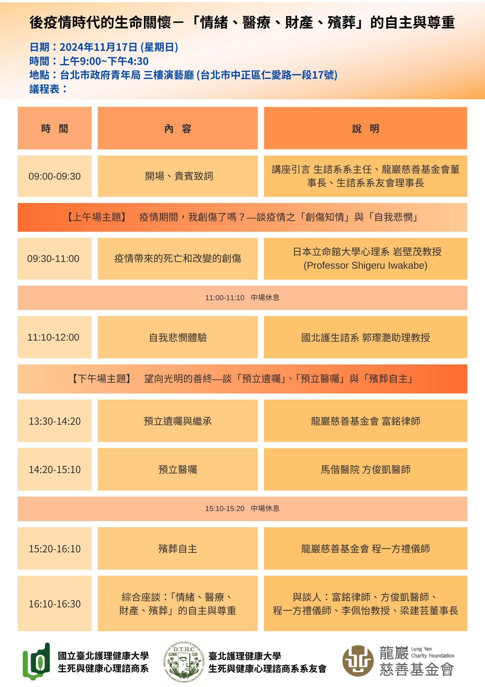 一、依據國立臺北健康護理大學113年10月24日北護生諮字第 1130016012號函辦理。 二、講座主題:「後疫情時代的生命關懷—『情緒、醫療、財 產、殯葬』的自主與尊重」。 (一)上午場講座:主題:疫情期間,我創傷了嗎?—談疫情 之「創傷知情」與「自我悲憫」。 (二)下午場講座:主題:望向光明的善終─談「預立遺 囑」、「預立醫囑」與「殯葬自主」。 (三)活動費用:免費參加。 三、課程講師:岩壁茂教授(Shigeru Iwakabe),郭瓈灧助理 教授,方俊凱醫師,富銘律師,程一方禮儀師等人四、時間地點:113年11月17日,上午9:00~下午4:30,臺北市 青年局 3 樓演藝廳 (臺北市中正區仁愛路一段17號)。 五、課程詳情及報名表單:https://forms.gle /TVPa2sG97FFDYhKc8。 六、相關疑問請洽詢承辦人,電子信箱:dthcalumni@gmail. com,官方Line@:@885ouoge,電話:(02)28227101轉 7252。 七、隨函檢附海報及活動議程各1份。