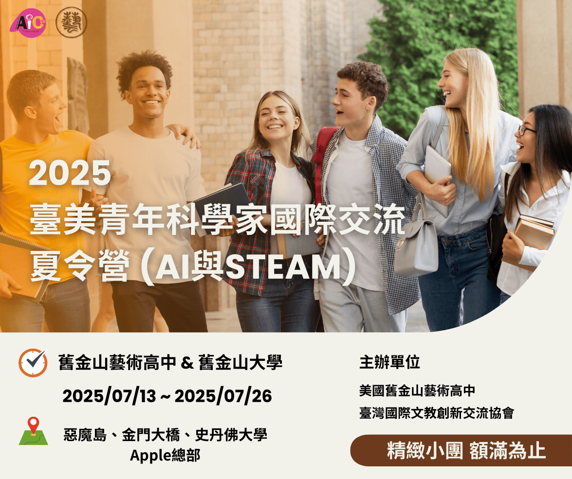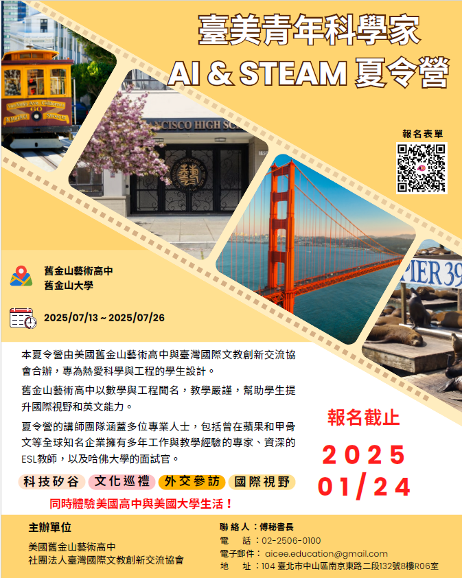 二、本夏令營將於明(2025)年7月13日(日)至7月26日 (六)舉辦,由本會帶團前往美國舊金山進行國際交流, 參與以ESL英文、AI程式設計與STEAM科學主題之課程,亦 安排參訪我國駐舊金山辦事處、史丹佛大學、舊金山大 學,造訪矽谷及舊金山著名景點,並與美國舊金山藝術高 中學生交流,完成夏令營活動之學生可獲頒舊金山藝術高 中結訓證書。