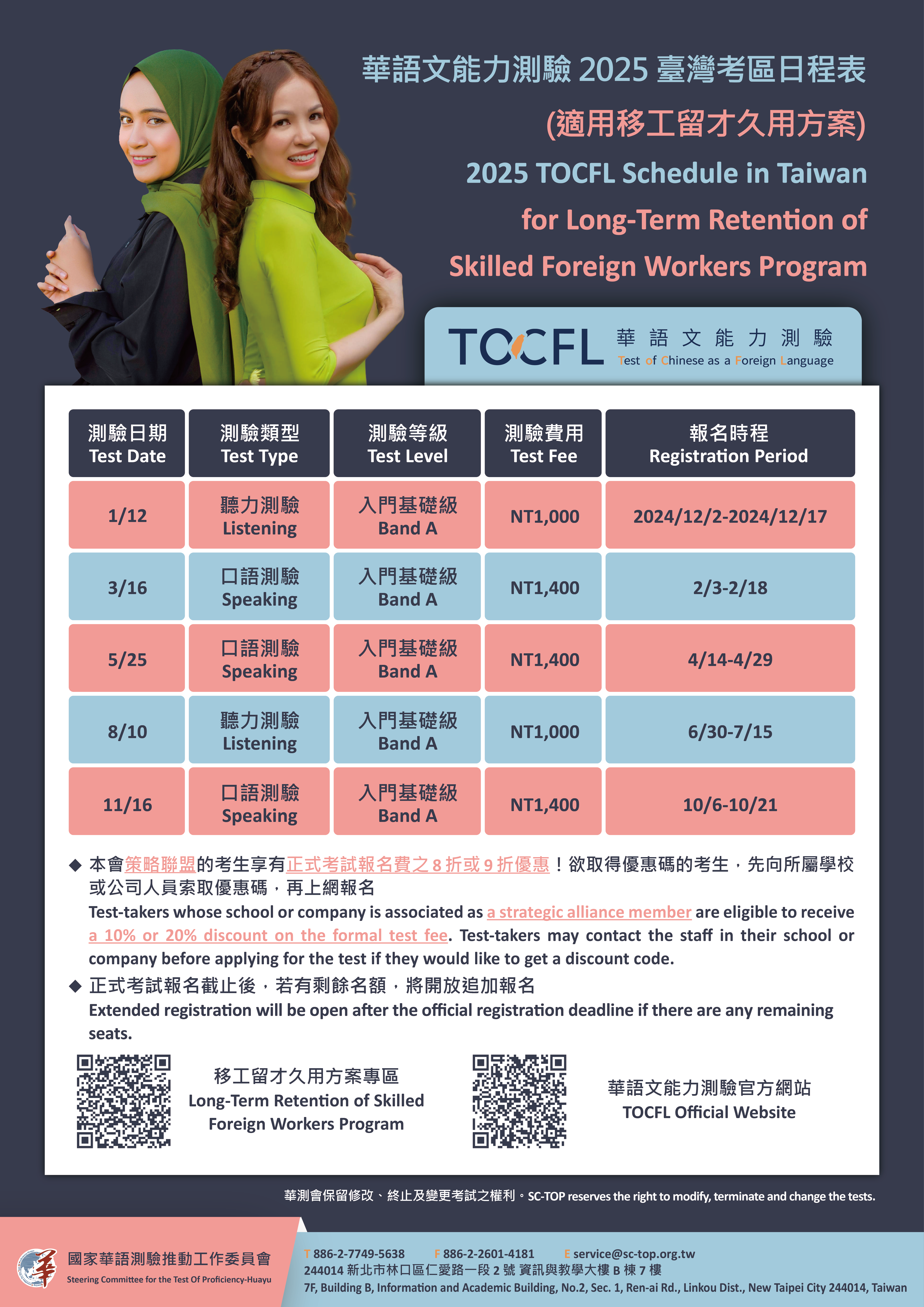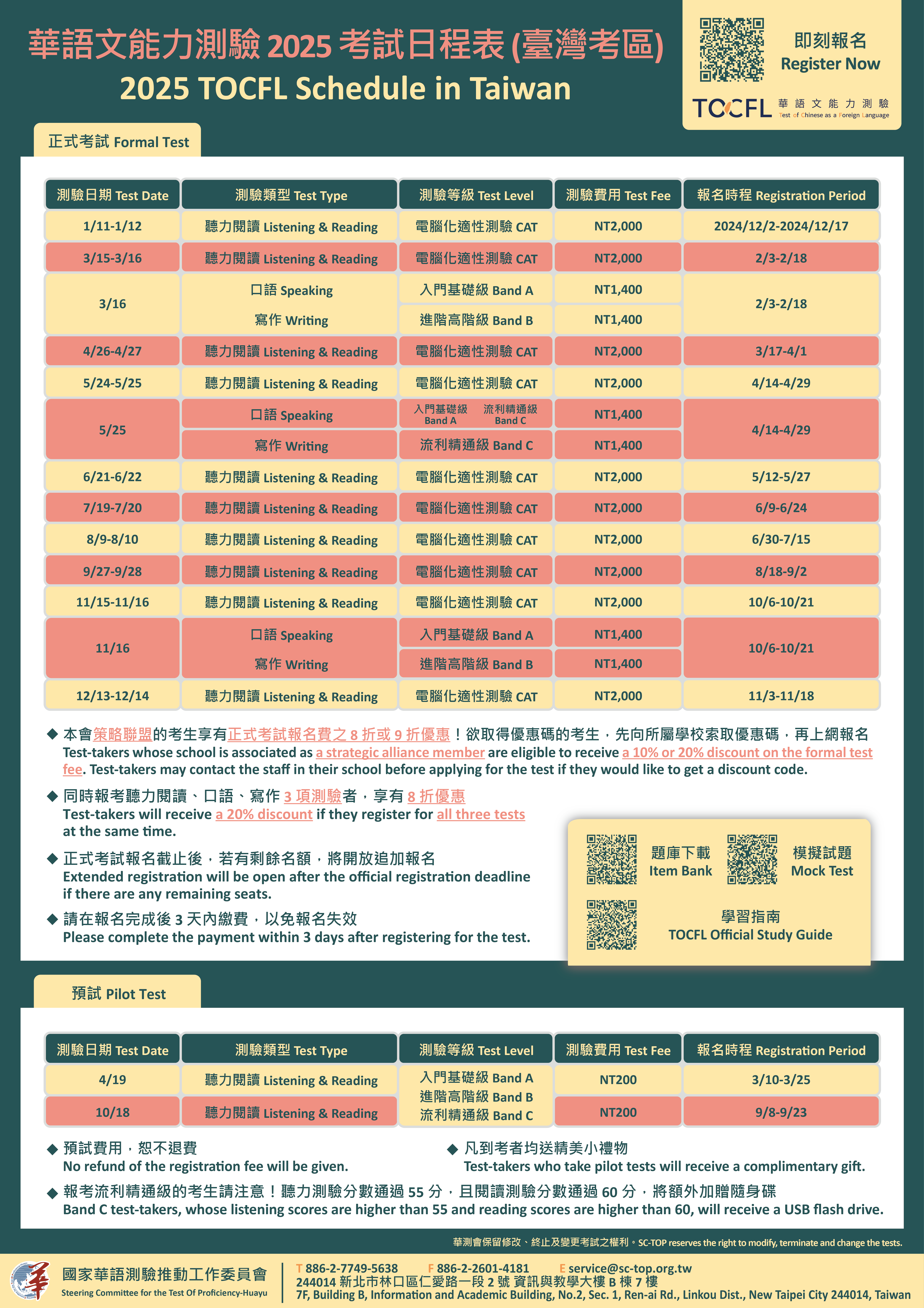 一、依據國家華語測驗推動工作委員會113年12月2日華測字第 1132000163號函辦理。 二、114年辦理考試說明如下: (一)舉辦10次聽讀測驗正式考試,皆辦理週六、日連續2 天。 (二)舉辦2次聽讀測驗大型預試,分別於4月及10月舉行,可 作為正式考試前之練習,熟悉測驗流程。 (三)為配合勞動部移工留才久用方案,舉辦2次聽力測驗正式 考試及3次口語測驗正式考試,皆於週日辦理。 (四)前揭考試時間詳見附件「定期考試日程表」。 三、測驗報名方式 (一)個人報名:請考生於報名期間逕至「華語文能力測驗線 上報名系統」報名。 (二)團體報名: 1、團體報名可於開放報名前一週向該會申請團報名額, 考生人數須達30位。由單一窗口彙整上傳報名資料與 考生照片,並於報名截止日前完成測驗費用匯款。 2、欲採團體報名,請務必提早作業,再三確認所有考生 之報名資料和照片齊全正確,倘違反考試規則,將導 致考生喪失應考資格,不能申請退費,請務必小心處 理。 3、為保障個人報名考生之權益,團報考生將由該會指定 考試中心。 四、報名相關連結: (一)114 年正式考試日程表:https://reurl.cc/Kdppk9。 (二)114 年預試日程表:https://reurl.cc/36jjN0。 (三)線上報名系統:https://tocfl.edu.tw/TW/。 五、學習資源: (一)準備級與入門級公開題庫,可練習正式考試中可能出現 的題目:https://reurl.cc/Y499Oa。 (二)線上模擬測驗:https://reurl.cc/qnOOZy。 (三)模擬試題下載:https://reurl.cc/r3QQZr。 六、倘對本考試尚有疑義,請逕洽該會王郁涵承辦人,聯絡電 話:02-77498204。 七、檢附旨案定期考試日程表、考試日程表宣傳海報、考區日 程表(適用移工留才久用方案)及考試規則各1份。