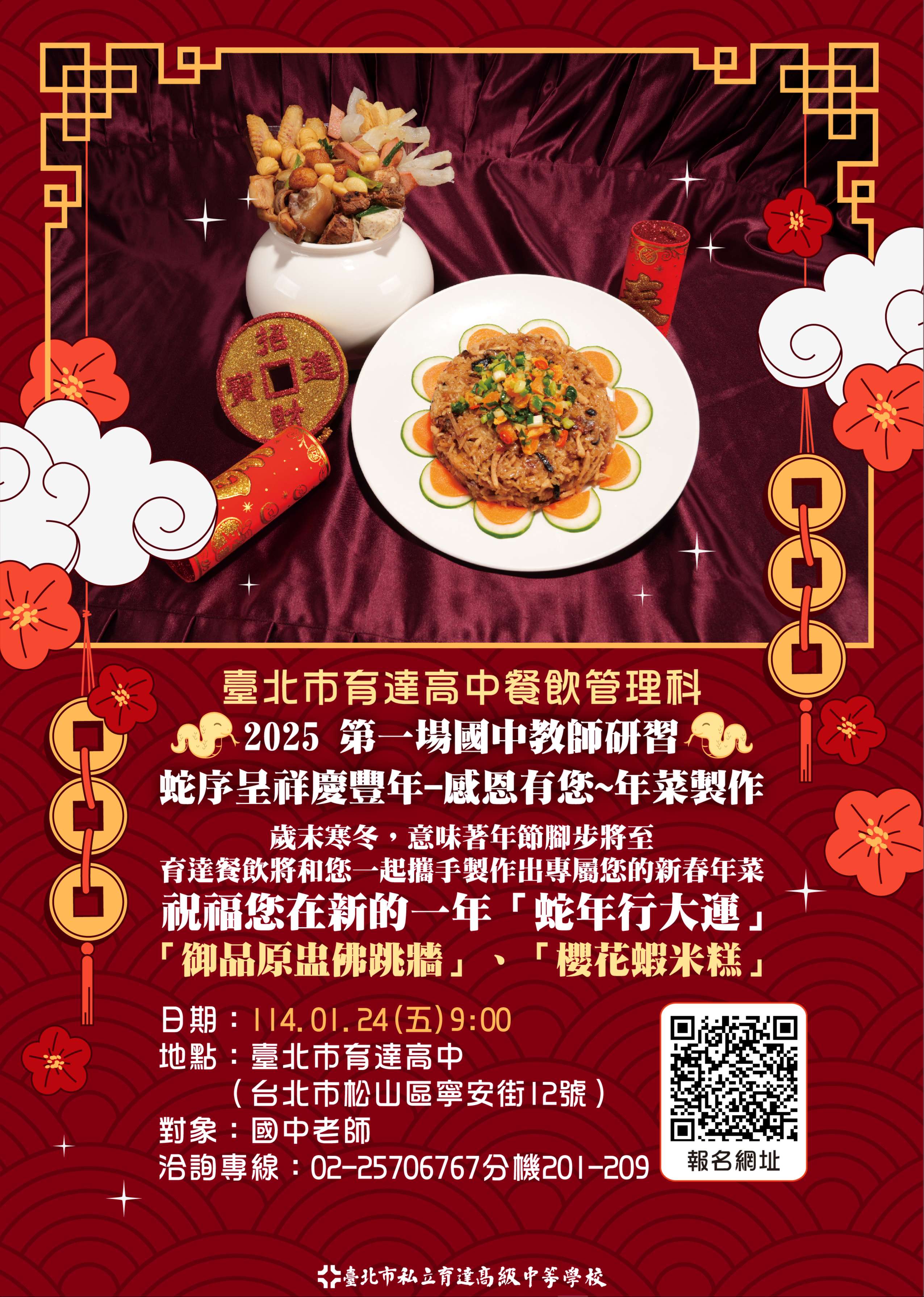 一、本校辦理2025教師研習-蛇序呈祥慶豐年-年菜製作,歡迎 各國中教師報名參加。 二、活動日期及內容:114年01月24日(五)上午9點,料理內容 為御品原盅佛跳牆、櫻花蝦米糕。 三、活動地點:臺北育達高中 (臺北市松山區寧安街12號、捷 運小巨蛋4號出口)。 四、活動採線上報名報名網址:https://reurl.cc/yDQG02,即 日起至額滿為止。 五、活動連絡人:02-25706767分機202巫老師。