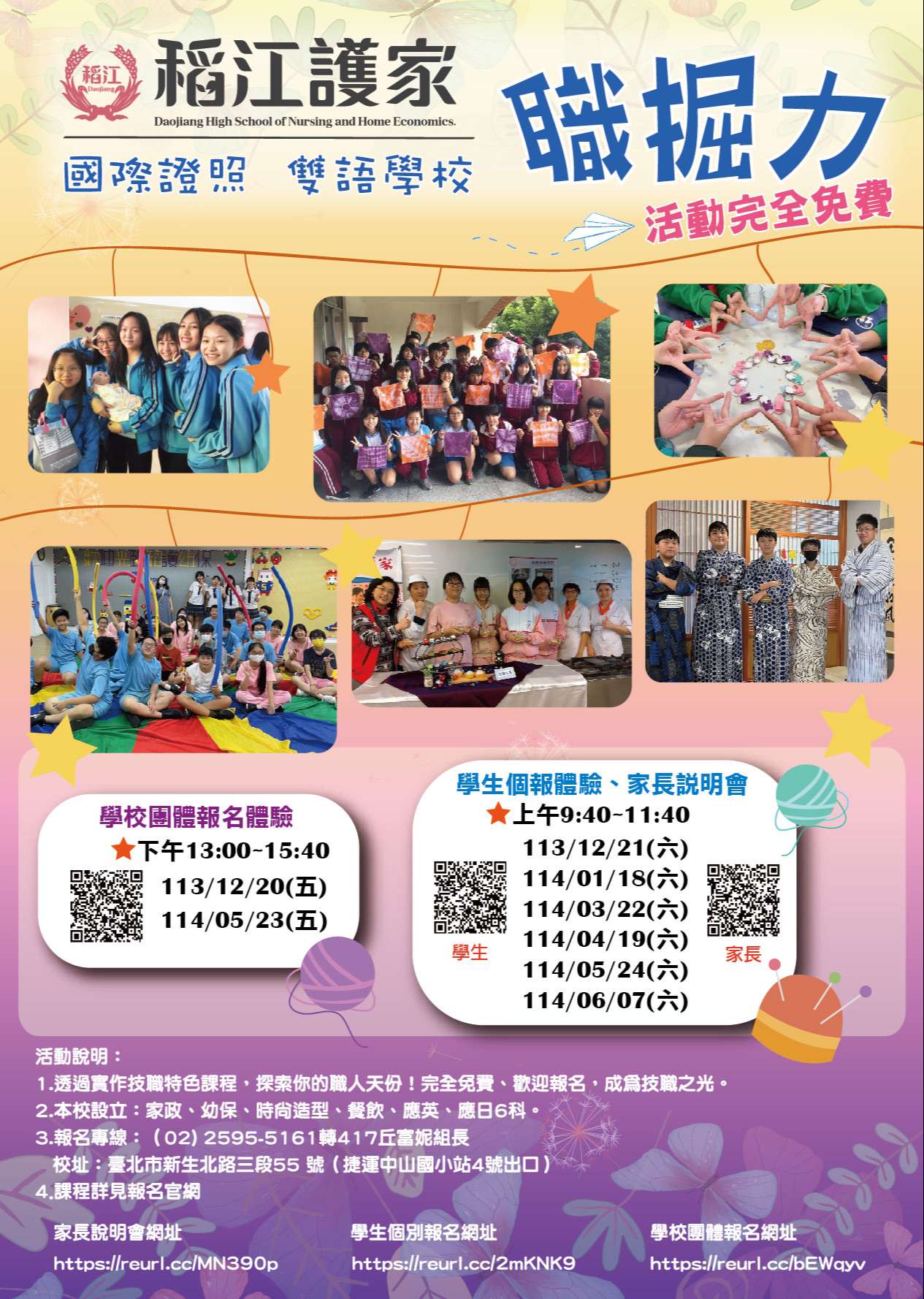 一、藉由實作體驗,增進學生及家長認識技職教育與職涯選擇 方向,以提供學生自我覺察與生涯探索,適性抉擇合適的 進路,以落實十二年國教適性揚才之教育目標。 二、本學期於114年5月23日(五)、3月22日(六)、4月19日 (六)、5月24日(六)及6月7日(六),辦理「稻江護家職掘力 實作體驗」,誠摯邀請 貴校八、九年級學生參加,並歡 迎 貴校教師或學生家長共同參與。 三、檢附活動報名表(含報名QR code),為利於統計人數,敬請 於各場次活動日一週前完成報名。(本校報名網址: http://reurl.cc./vgWA2j) 四、各校如欲於表列活動時間以外時段來校參觀,或有其他職 群體驗課程需求,請洽臺北市稻江護家技職試探組丘富妮組長,電話:2595-5161,分機417。