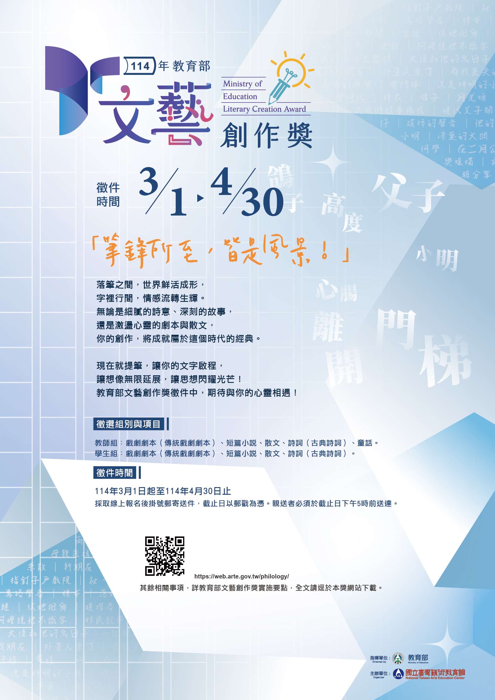 六、參選受理期間:自114年3月1日起至114年4月30日截止,採 取先線上報名(網址:https://web.arte.gov.tw/philology/),後以掛號郵寄送件方式辦理,截止日以郵 戳為憑;親送者必須於截止日下午5時前送達。