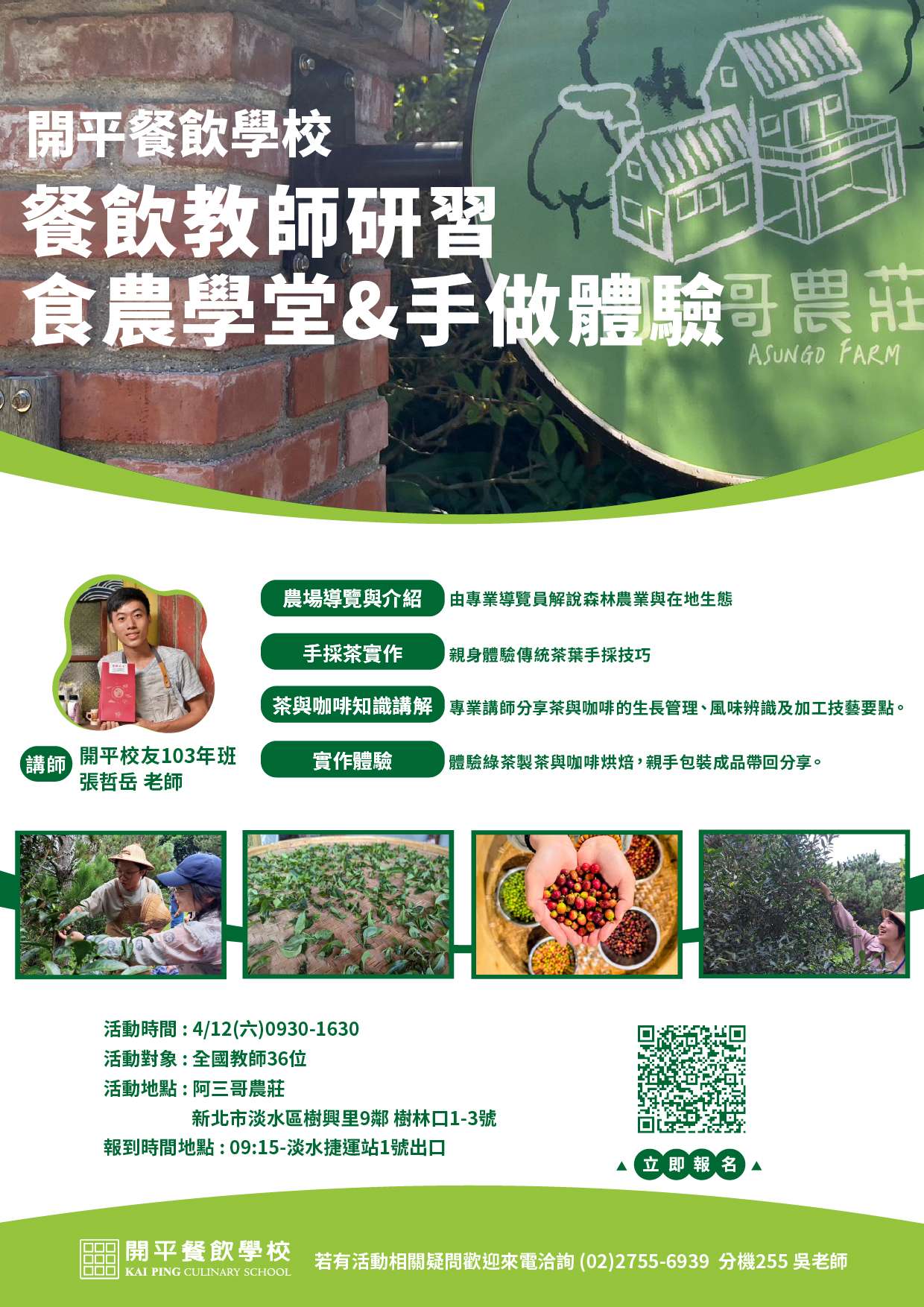 一、為協助國中教師認識技職體系之學習內容、教學特色及進 路發展。本次教師研習融入「食農教育」主題,透過農莊 園區導覽、實作體驗及餐飲知能更加了解餐飲技職體系, 進而發揮協助學生適性就學選擇之輔導。 二、辦理日期:114年4月12日(六)09:30-16:30。 三、研習對象:全國國中教師。 四、報名方式:採線上報名,請上”全國教師在職進修資訊網” 報名,課程名稱:餐飲教師研習_食農學堂&手作體驗,課 程代碼:4919597。報名截止日期:114年04月09日(三), 課程名單將於開課前三天確認遴選名單。 五、研習集合時間、地點:當日上午9:15-9:30報到(9:30發車)於淡水捷運站一號出口處。 六、研習地點:新北市淡水區樹興里樹林口1-3號。 七、研習時數:全程參與者,俟研習結束後核給研習時數。 八、研習詳細內容請參閱實施計畫,有相關事宜,歡迎洽詢 2755-6939轉255,吳老師。