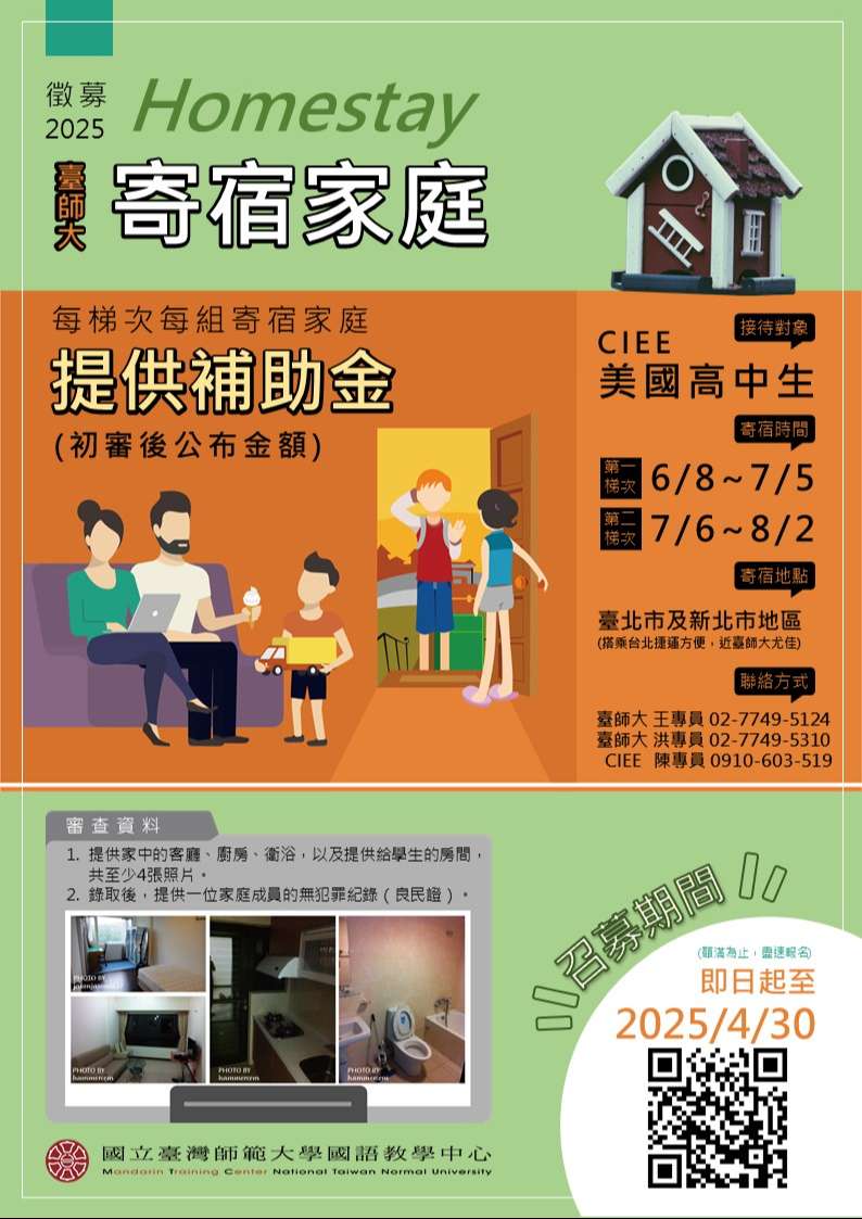 一、目的: 為促進美國高中生於臺學習期間與當地臺灣人進行 文化交流、培養日常生活中運用華語的能力,故特別招募 台灣寄宿家庭,提供高中生四週上課期間的寄宿接待。本 次辦理招募相關說明會,並分享接待家庭之相關經驗,敬 邀各校校長、主任、師長、國際教育承辦人及有興趣之家 長參加。 二、說明會時間: 114年3月19日(三) 10:00-12:00。(09:30報 到入場) 三、說明會地點: 大安高工行政大樓第一會議室。(恕無法提供 停車位) 四、請貴校協助轉知相關訊息予有興趣之家庭。參與本說明會之師長,建請貴校核予公假,課務自理。 五、報名網址: Google16344045_1143003522_1.sw https://forms.gle/BiRhuidDSM8zF6vG7 (報名於3月18日 17:00截止)。 六、說明會相關問題請洽大安高工洪鐿瑄老師 02-27091630 分 機1218。
