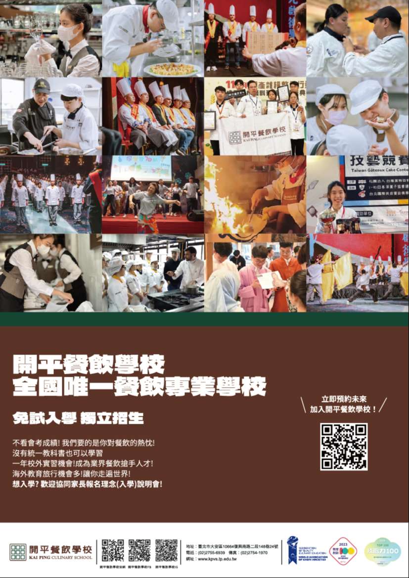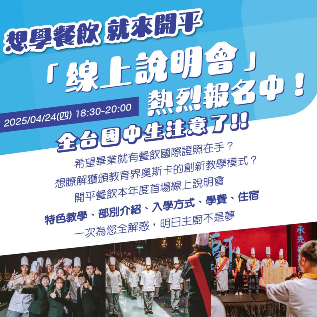 一、為使更多國中學生對技職教育深入瞭解,本校辦理「實體 理念說明會」及「線上理念說明會」,提供學生、家長認 識本校教育理念與餐飲教學特色,協助增進國中學生及其 家長對職業類科升學管道及學習內容之試探,期望開平優 秀學子成為臺灣及國際餐飲界之人才。 二、請貴校協助公告轉知,以利學生及家長報名,亦可至本校 官網(https://www.kpvs.tp.edu.tw/)查詢。 三、本校實體理念說明會辦理日程謹訂於114年03月22日(星期 六)、04月13日(星期日)、05月03日(六)辦理;線上理念說 明會辦理日程謹訂於114年04月24日(四)1830-2000,惠請 貴校一併轉知所屬學生,歡迎有興趣的同學及家長至: https://www.kpvs.tp.edu.tw/admission/application/線上報名;如有招生入學相關疑問可來電洽詢本校聯合服 務室(02)2755-6939分機211。
