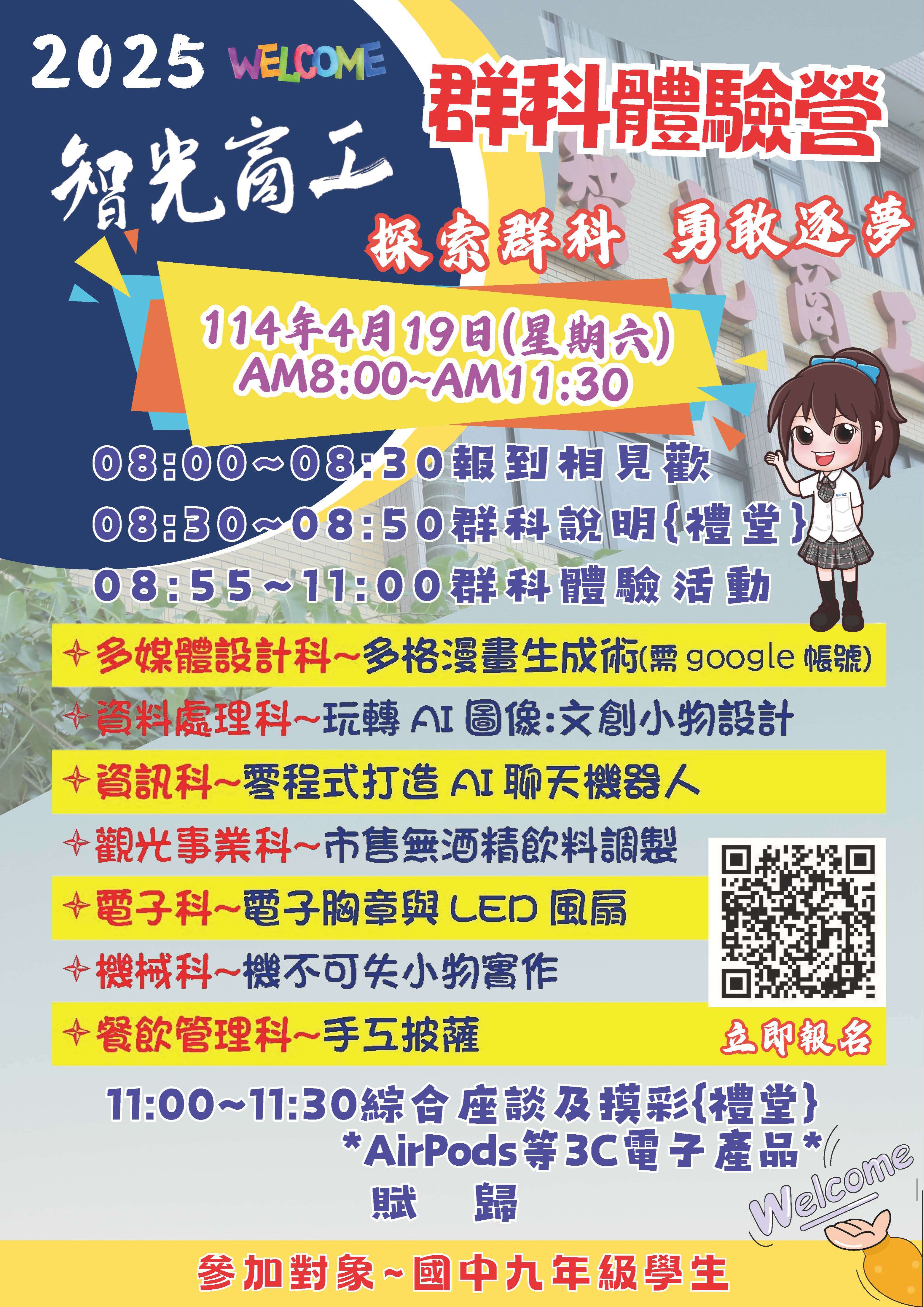 一、依據國教署113學年度高級中等學校完全免試入學資源挹注 計畫B2-1「生涯探索、預見未來」子計畫辦理。 二、活動時間:114年4月19日(星期六) 08:00~11:30 三、活動地點:新北市智光商工 四、活動費用:免費 五、詳細內容如附件 六、活動聯絡人:智光商工教務處招生組劉仲平組長,電話 (02)-2943-2491分機888。 七、敬請協助公告,並鼓勵九年級學生踴躍報名參加。