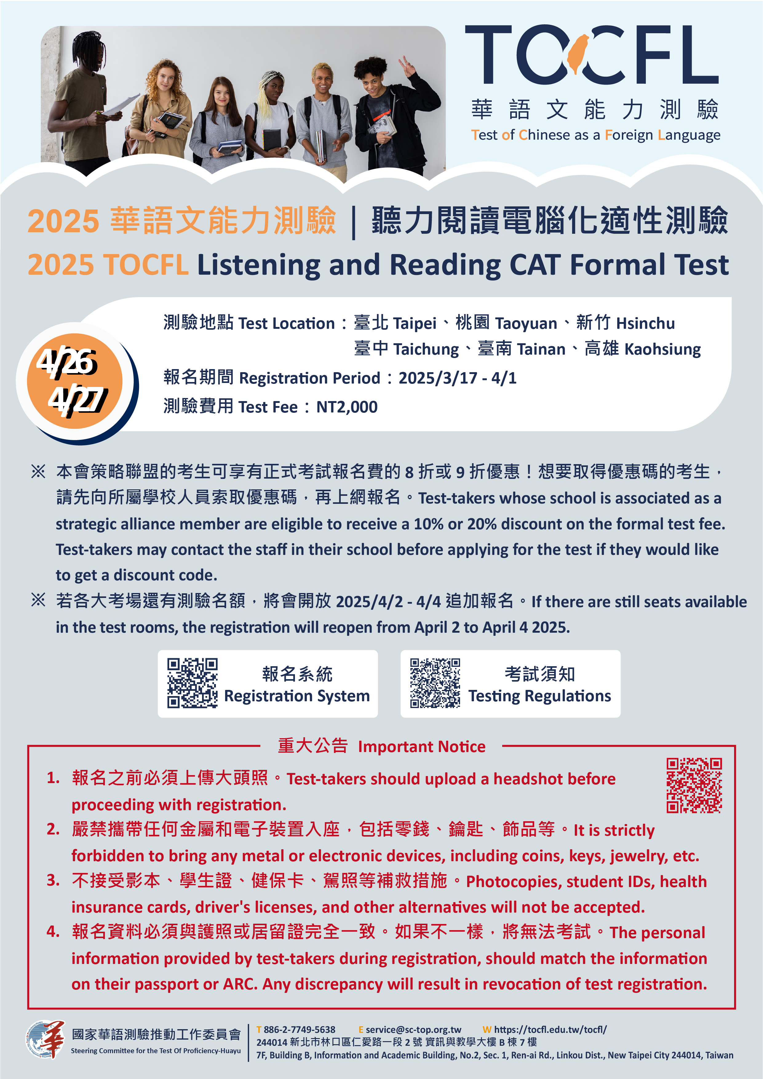 一、依據國家華語測驗推動工作委員會114年3月14日華測字第 1142000043號函辦理。 二、報名時程:即日起至4月1日(星期二)止,報名截止日 後,若有剩餘名額,將開放追加報名至4月4日止。 三、測驗日期:4月26至4月27日(星期六、星期日)聽讀測 驗-電腦化適性測驗。 四、測驗地點:國立臺北教育大學、國立臺灣大學、德明財經 科技大學、中原大學、國立清華大學、靜宜大學、國立中 興大學、崑山科技大學及文藻外語大學等9所考試中心。 五、測驗費用:新臺幣(以下同)2,000元。 六、以校為單位,考生人數超過30位可申請團體報名,詳情請 見官網(https://tocfl.edu.tw/tocfl/index.php/sign_up/tw/list/1)。 七、優惠訊息:為該會策略聯盟單位,所屬外籍人士可享九折 優惠。 八、為協助考生熟悉各等級題型,該會將於4月19日舉辦聽讀測 驗分級預試,報名費200元,報名至3月25日止。考生透過 該會策略聯盟團報,報名費全免。詳請請洽呂靜佩專員, 聯絡電話:02-77498213;電子信箱:peggy0521@sc-top. org.tw。 九、報名網址:https://tocfl.edu.tw/TW/。 十、線上模擬測驗:https://tocfl.edu.tw/tocfl/index.php /exam/test/page/19。 十一、檢附旨案宣傳海報1份。