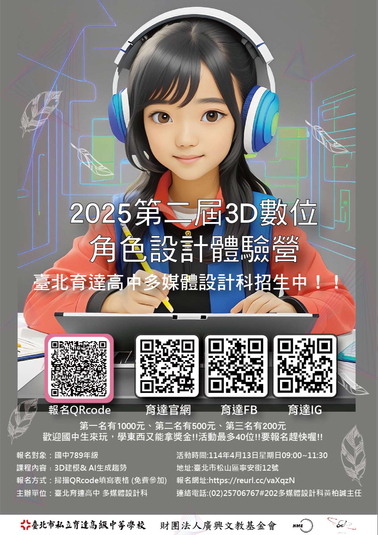 一、育達高中以掌握趨勢,培育達人作為宗旨,希望能夠讓更 多學生及早學習職場技能,在業界成為佼佼者。「3D數位 遊戲藝術」為勞動部全國技能競賽職種,本校4年來協助培 訓3D職種榮獲多項佳績,本次活動找來3D動畫師,歡迎國 中生來體驗!! 二、活動訊息: (一)活動費用:全部免費(國中生) (二)活動時間2025年4月13日星期日 09:00~11:30 (三)辦理地點:臺北育達高中(臺北市松山區寧安街12號) (四)表現優異前三名會發放獎金,第一名有1000元、第二名 有500元、第三名有200元,有學又有錢拿,歡迎參加。 三、報名網址:https://reurl.cc/vaXqzN 四、活動聯絡人:多媒體設計科主任黃柏諴,如有問題請洽專線:(02)25706767#202 五、附件一活動海報