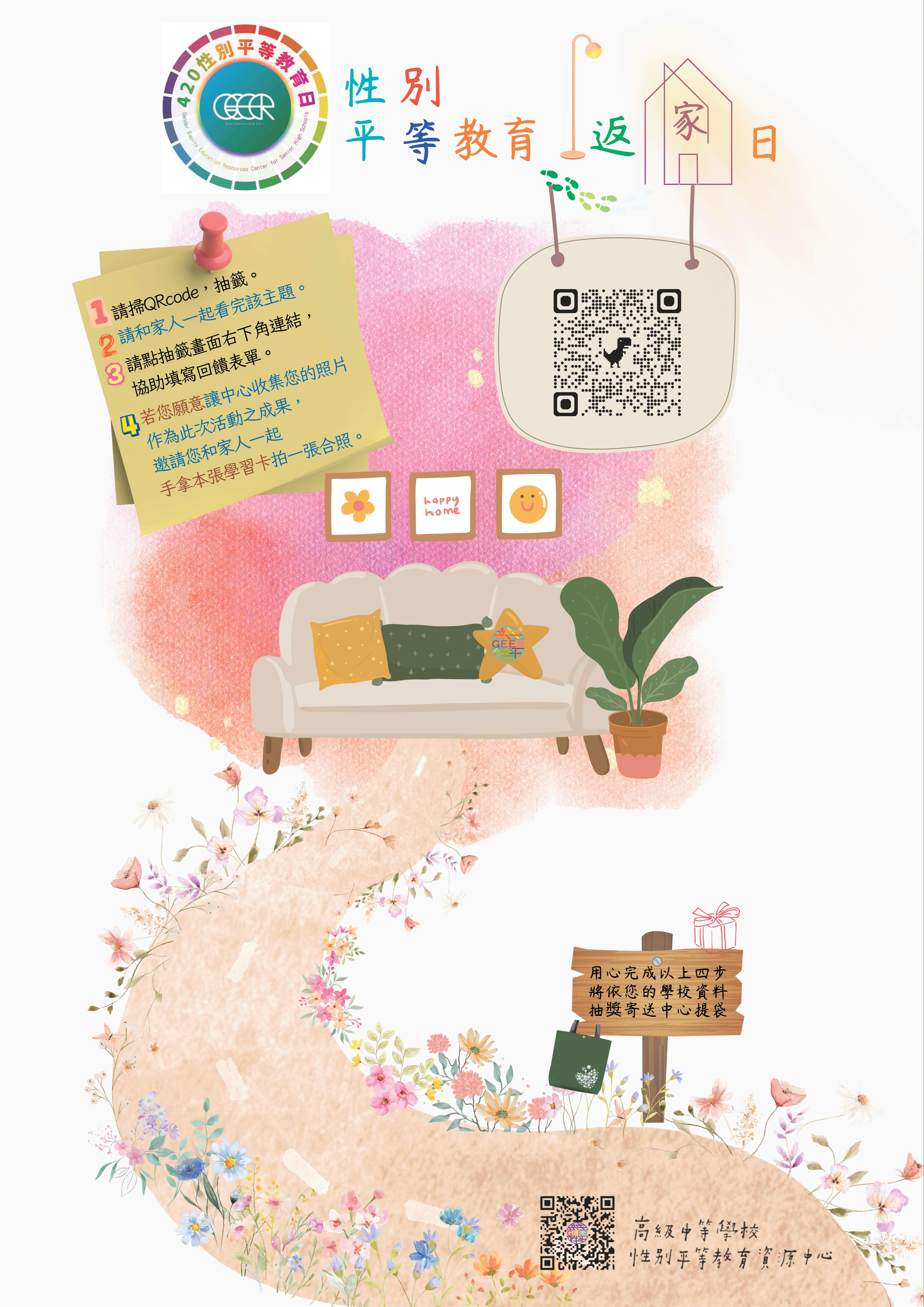 一、依據教育部國民及學前教育署114年4月22日臺教國署學字 第1145802359A號函辦理。 二、為讓學生瞭解性別平等教育之意涵,俾落實性別平等教 育,該署性別平等教育資源中心以「性別與家庭」為主 軸,設計學習卡、海報及推薦書單,鼓勵學校教師透過課 程或班級活動向學生宣導。 三、請參酌網站所建置教學資源,作為性別平等教育議題融入 教學及宣導所用: (一)該署性別平等教育資源中心網站,連結: https://friendlycampus.k12ea.gov.tw/Gender。 (二)教育部性別平等教育全球資訊網,連結:https://www. gender.edu.tw/web/index.php/home。