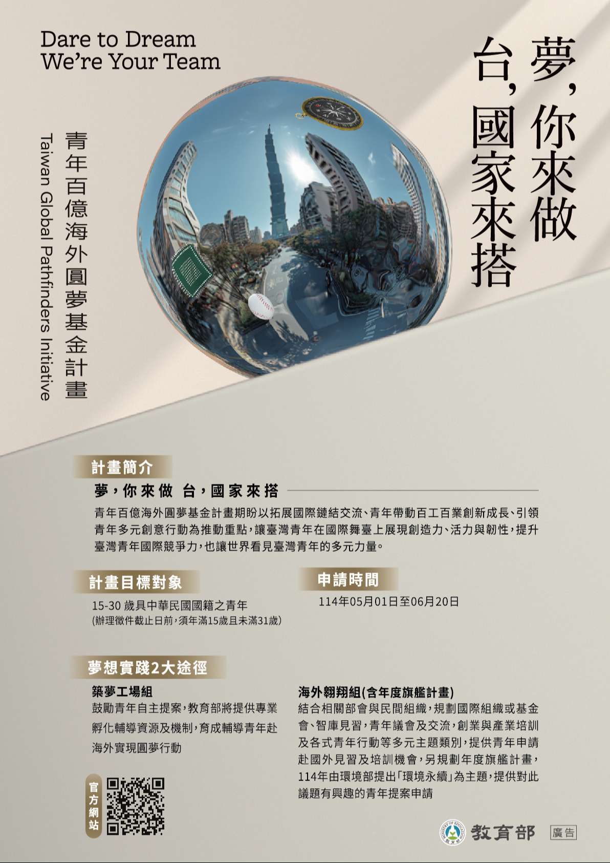 一、依教育部114年5月2日臺教授青字第1140000182號函辦 理。 二、旨揭計畫期盼以拓展國際鏈結交流、青年帶動百工百業創 新成長、引領青年多元創意行動為推動重點,讓臺灣青年 在國際舞臺上展現創造力、活力與韌性,提升臺灣青年國 際競爭力,也讓世界看見臺灣青年的多元力量。 三、本計畫對象為本國15至30歲青年,分為築夢工場組與海外 翱翔組(含年度旗艦計畫),第2梯次報名自114年5月1日 起至6月20日,海外翱翔組旗艦計畫自4月1日至6月20日, 相關資訊可上計畫平臺查詢(https://twpathfinder.org /):(一)築夢工場組:鼓勵青年自主提案,青年署將提供專業孵 化輔導資源及機制,育成輔導青年赴海外實現圓夢行 動。 (二)海外翱翔組(含年度旗艦計畫): 1、結合相關部會與民間組織,規劃國際組織或基金會、 智庫見習,青年議會及交流,創業與產業培訓及各式 青年行動等多元主題類別,提供青年申請赴國外見習 及培訓機會。 2、114年度旗艦計畫由環境部以「環境永續」為主題,提 供對此議題有興趣之青年提案申請。 (三)檢附「青年百億海外圓夢基金計畫」第二梯次築夢工場 組、海外翱翔組簡章各1份及計畫海報電子檔1份。(一)築夢工場組:鼓勵青年自主提案,青年署將提供專業孵 化輔導資源及機制,育成輔導青年赴海外實現圓夢行 動。 (二)海外翱翔組(含年度旗艦計畫): 1、結合相關部會與民間組織,規劃國際組織或基金會、 智庫見習,青年議會及交流,創業與產業培訓及各式 青年行動等多元主題類別,提供青年申請赴國外見習 及培訓機會。 2、114年度旗艦計畫由環境部以「環境永續」為主題,提 供對此議題有興趣之青年提案申請。 (三)檢附「青年百億海外圓夢基金計畫」第二梯次築夢工場 組、海外翱翔組簡章各1份及計畫海報電子檔1份。
